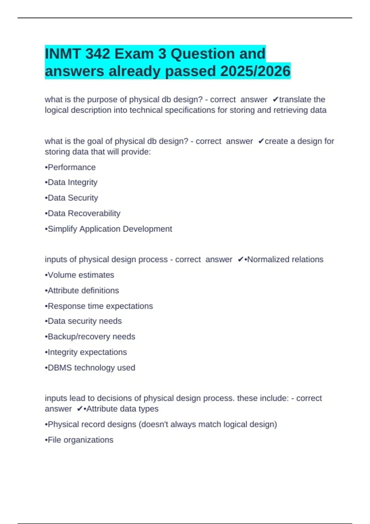 INMT 342 Exam 3 Question and answers already passed 2025/2026 what is the purpose of physical db design? - correct answer translate the logical description into technical specifications for storing and retrieving data what is the goal of physical db design? - correct answer create a design for storing data that will provide: •Performance •Data Integrity •Data Security •Data Recoverability •Simplify Application Development inputs of physical design process - correct answer •Normalized relations •Volume estimates •Attribute definitions •Response time expectations •Data security needs •Backup/recovery needs •Integrity expectations •DBMS technology used