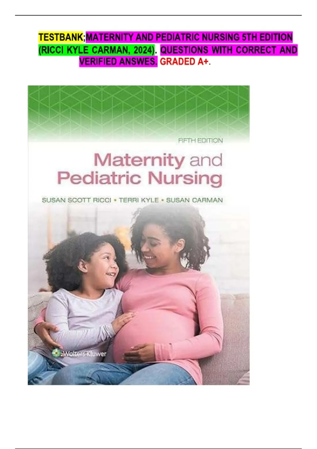 TESTBANK;MATERNITY AND PEDIATRIC NURSING 5TH EDITION (RICCI KYLE CARMAN, 2024). QUESTIONS WITH CORRECT AND VERIFIED ANSWES. GRADED A+.