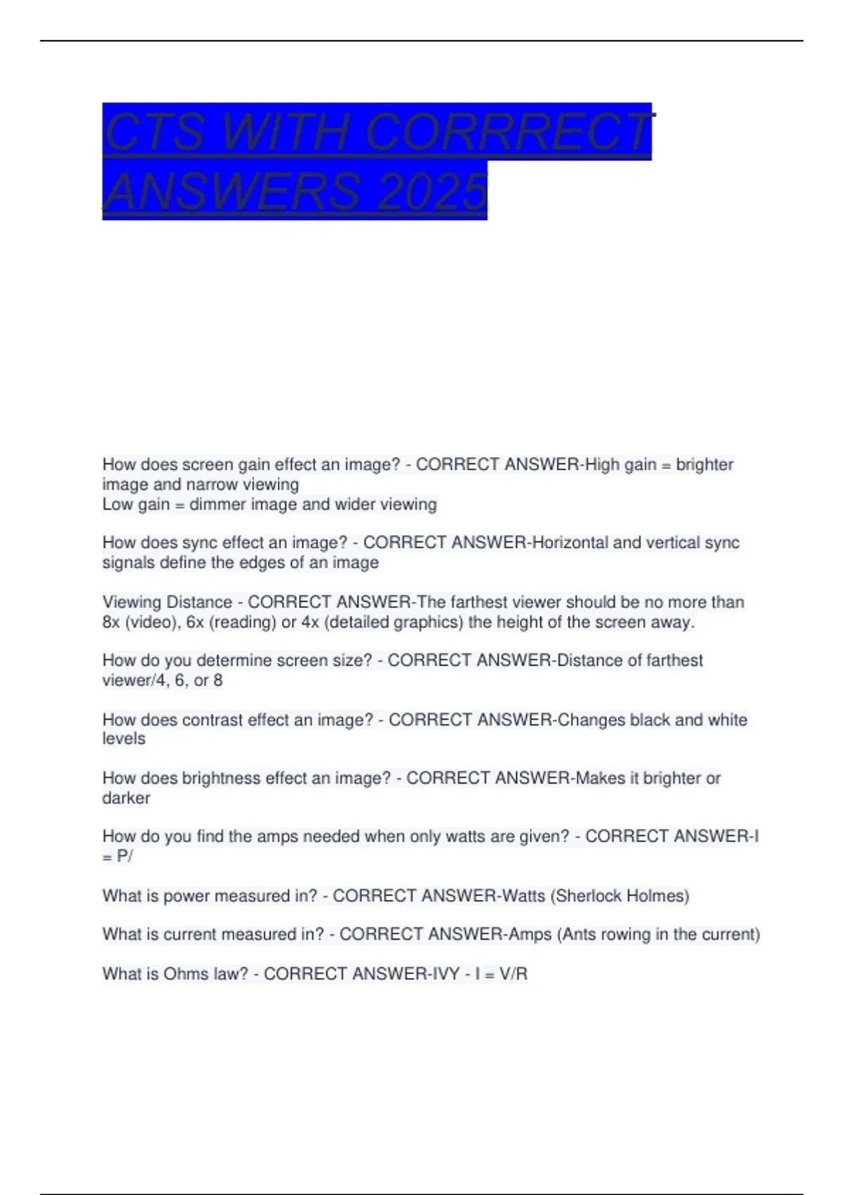 Ace the CTS Exam 2025 with this essential guide featuring correct answers, formulas, and key AV concepts—including screen gain, Ohm’s Law, viewing distance, audio systems, and program reporting.