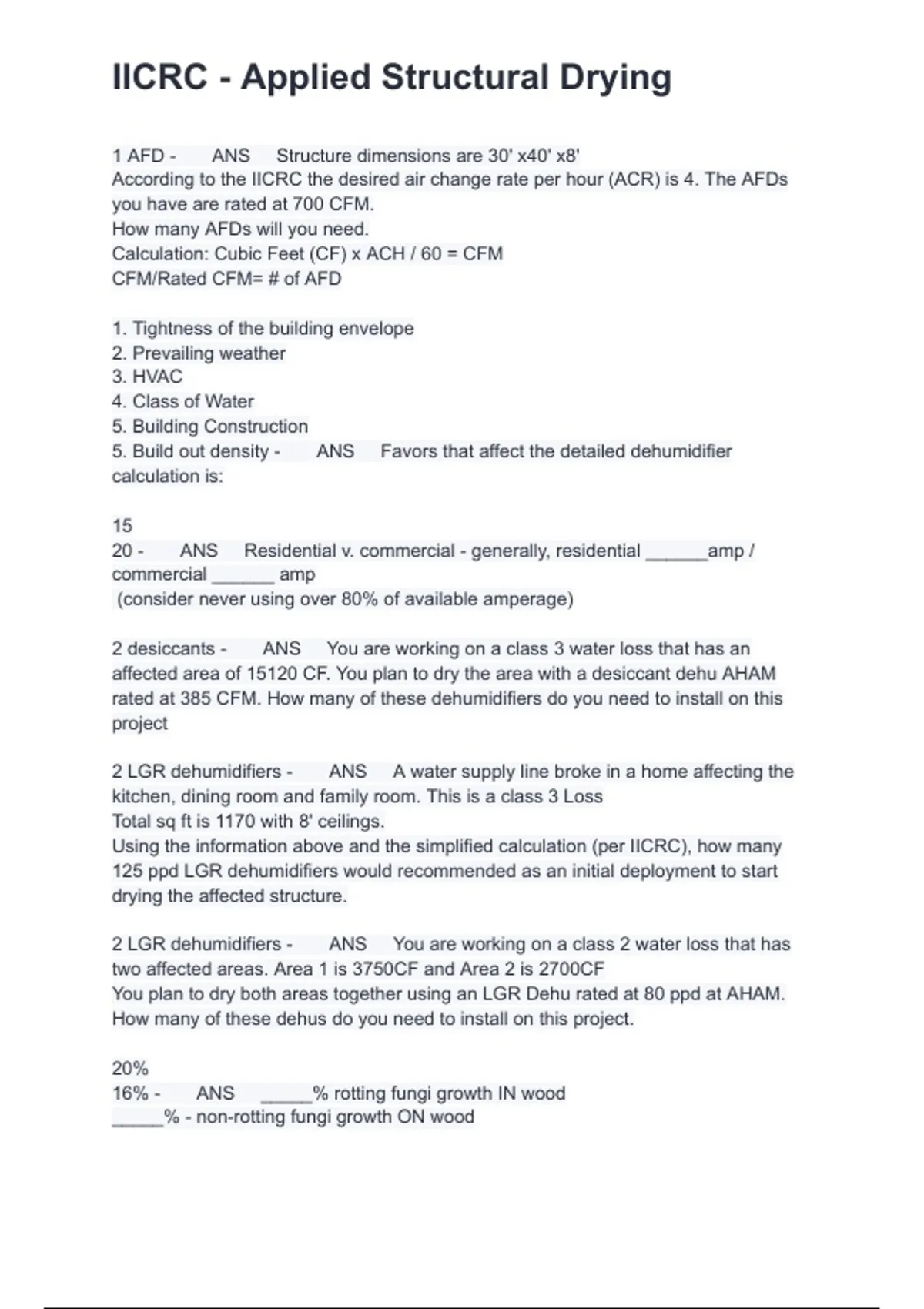 This document provides a comprehensive study guide for IICRC Applied Structural Drying (ASD), including detailed questions, answers, and calculation examples. Topics covered include air movers, dehumidifiers, air filtration devices, drying standards, psychrometrics, moisture measurement, water loss categories and classes, and safety regulations. It serves as a full preparation resource for restoration professionals studying for certification or reviewing field practices.
