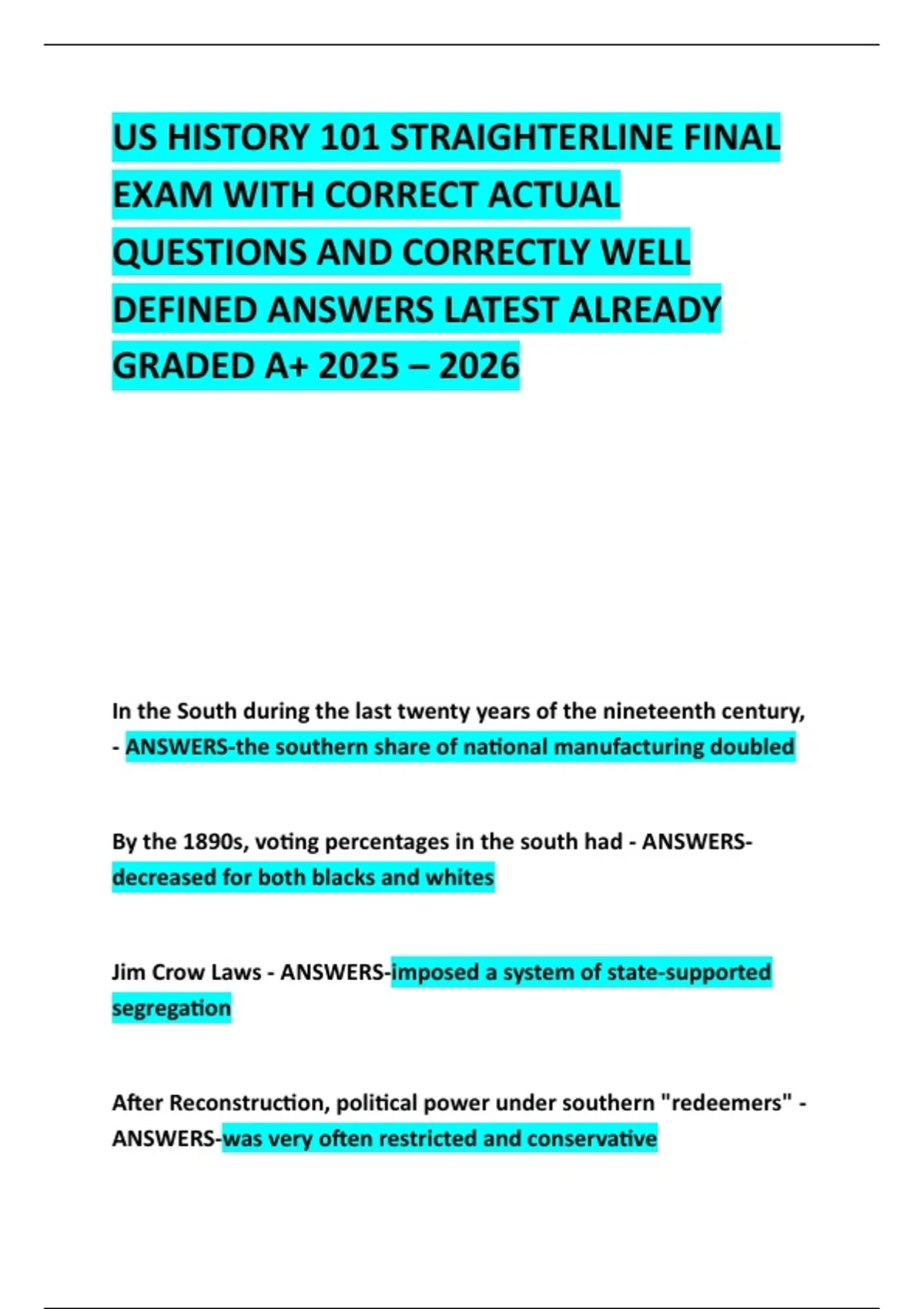 US HISTORY 101 STRAIGHTERLINE FINAL EXAM WITH CORRECT ACTUAL QUESTIONS AND CORRECTLY WELL DEFINED ANSWERS LATEST ALREADY GRADED A+ 2025 – 2026