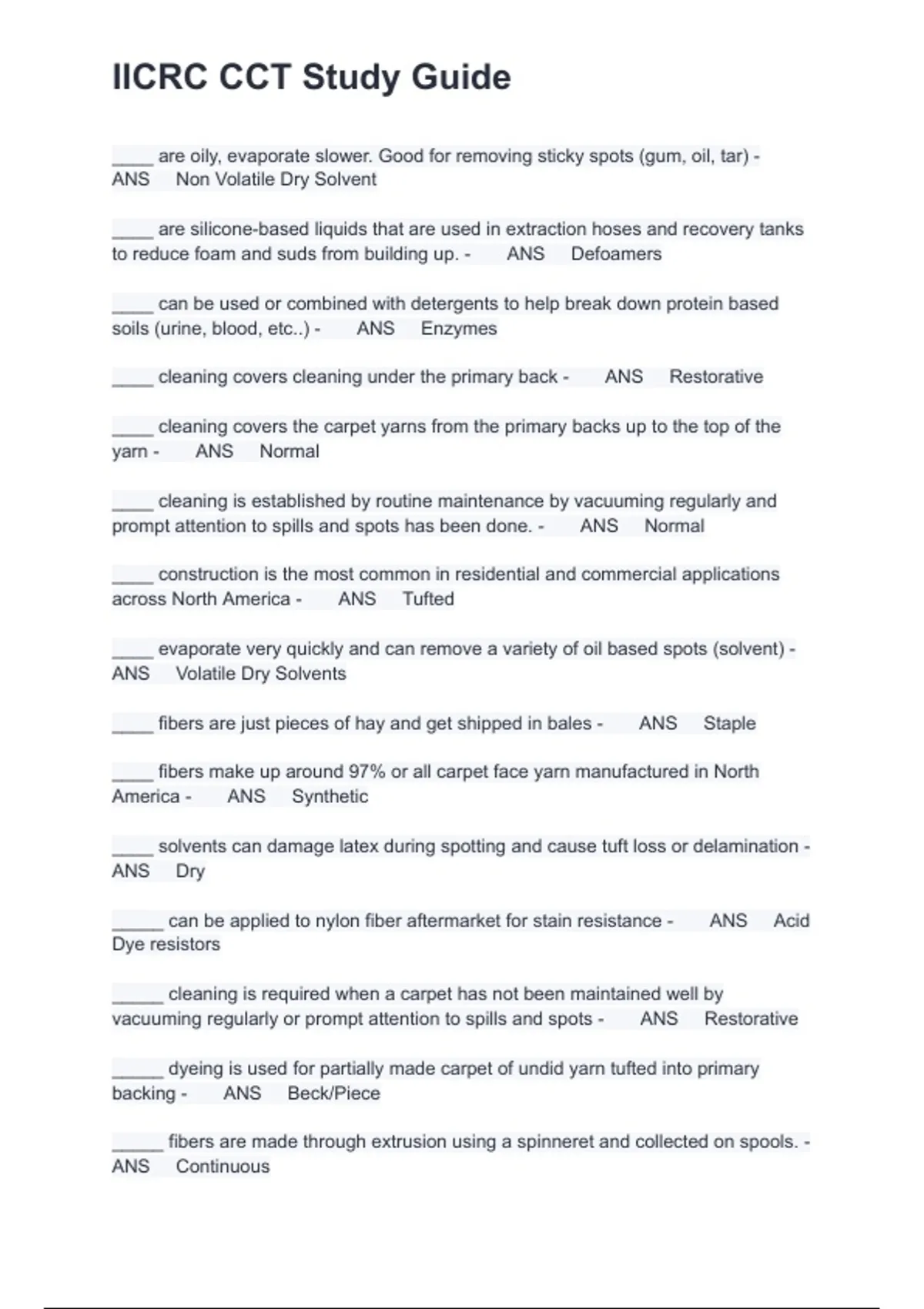 This document provides a comprehensive study guide for the IICRC CCT (Carpet Cleaning Technician) exam for 2025/2026. It includes detailed questions and answers on carpet fibers, construction methods, dyeing processes, cleaning techniques, stain removal, spotting agents, solvents, pH guidelines, burn tests, and industry safety standards. It serves as a complete preparation resource for technicians pursuing certification and professionals reviewing carpet cleaning best practices