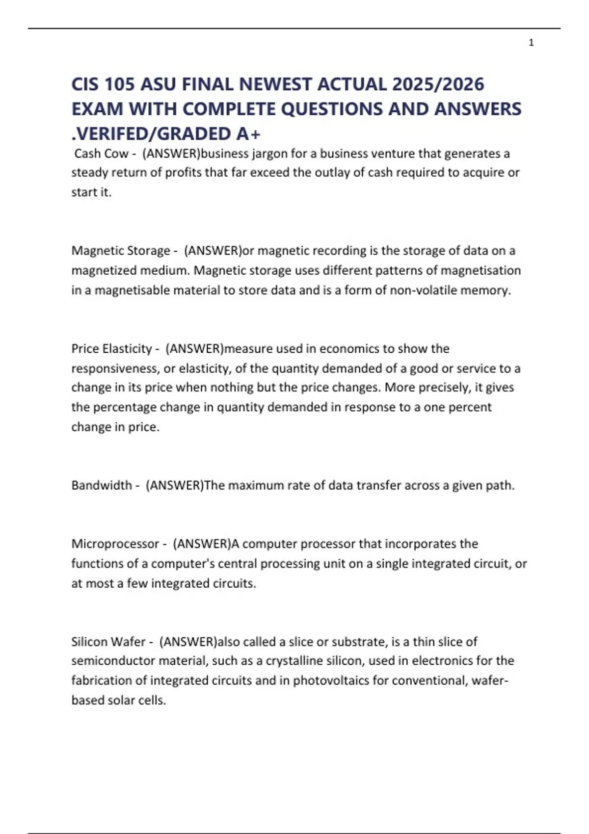 CIS 105 ASU FINAL NEWEST ACTUAL 2025/2026 EXAM WITH COMPLETE QUESTIONS AND ANSWERS .VERIFED/GRADED A+