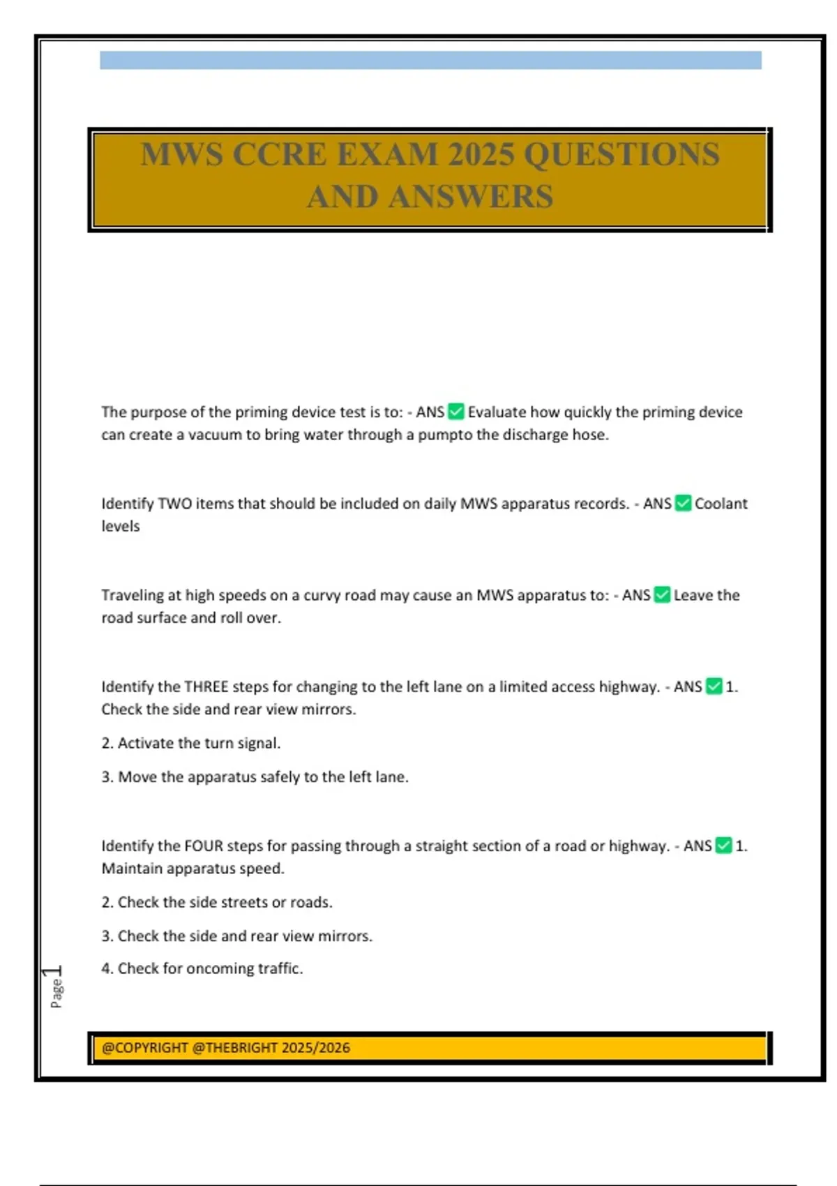 The purpose of the priming device test is to: - ANS Evaluate how quickly the priming device can create a vacuum to bring water through a pumpto the discharge hose. Identify TWO items that should be included on daily MWS apparatus records. - ANS Coolant levels Traveling at high speeds on a curvy road may cause an MWS apparatus to: - ANS Leave the road surface and roll over. Identify the THREE steps for changing to the left lane on a limited access highway. - ANS 1. Check the side and rear view mirrors. 2. Activate the turn signal. 3. Move the apparatus safely to the left lane. Identify the FOUR steps for passing through a straight section of a road or highway. - ANS 1. Maintain apparatus speed. 2. Check the side streets or roads. 3. Check the side and rear view mirrors. 4. Check for oncoming traffic. MWS CCRE EXAM 2025 QUESTIONS AND ANSWERS @COPYRIGHT @THEBRIGHT 2025/2026 Page2 When performing the serpentine exercise, you: - ANS Should only travel in one direction, without striking the obstruction. All of the following statements about driving an MWS apparatus through areas of restricted horizontal and vertical clearances are true EXCEPT: - ANS Use the appropriate turn signal. The best type of strainer to use in a shallow stream is a: - ANS Floating strainer. NFPA rates all fire pumps to meet their capacity from a draft at: - ANS 10 feet of lift. Which equation is used to determine the elevation pressure loss for resupplying a pumper located approximately 20 feet above the location of the MWS? - ANS EP = 0.5x20 The best definition of water pressure is the: - ANS Force of water per unit area. All of the following factors must be included when determining the total pressure loss (TPL) EXCEPT: - ANS Pump pressure loss The hand method can be used for estimating the friction loss in a hoseline with a diameter of: - ANS 2 1/2 inches Large diameter hoses are generally defined as hoses with a diameter between: - ANS 4-6 inches. When a dry supply line is being charged, it is important to open the: - ANS Bleeder valve. One of the drawbacks of