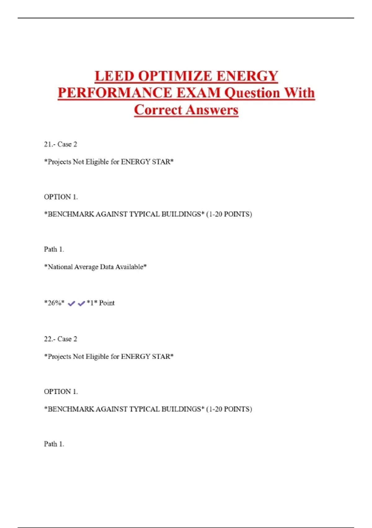 LEED OPTIMIZE ENERGY PERFORMANCE EXAM Question With Correct Answers 21.- Case 2 *Projects Not Eligible for ENERGY STAR* OPTION 1. *BENCHMARK AGAINST TYPICAL BUILDINGS* (1-20 POINTS) Path 1. *National Average Data Available* *26%* 22.- Case 2 *1* Point *Projects Not Eligible for ENERGY STAR*
