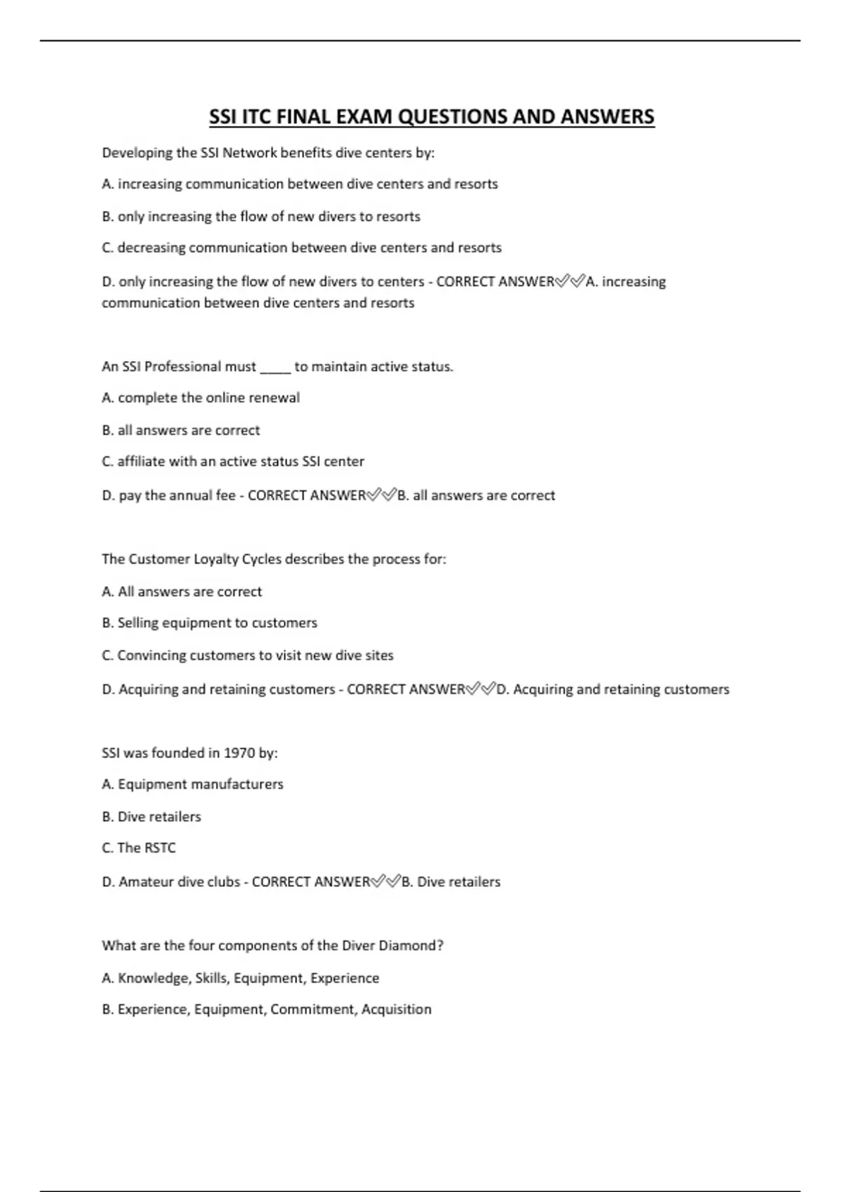 SSI ITC FINAL EXAM QUESTIONS AND ANSWERS Developing the SSI Network benefits dive centers by: A. increasing communication between dive centers and resorts B. only increasing the flow of new divers to resorts C. decreasing communication between dive centers and resorts D. only increasing the flow of new divers to centers - CORRECT ANSWERA. increasing communication between dive centers and resorts