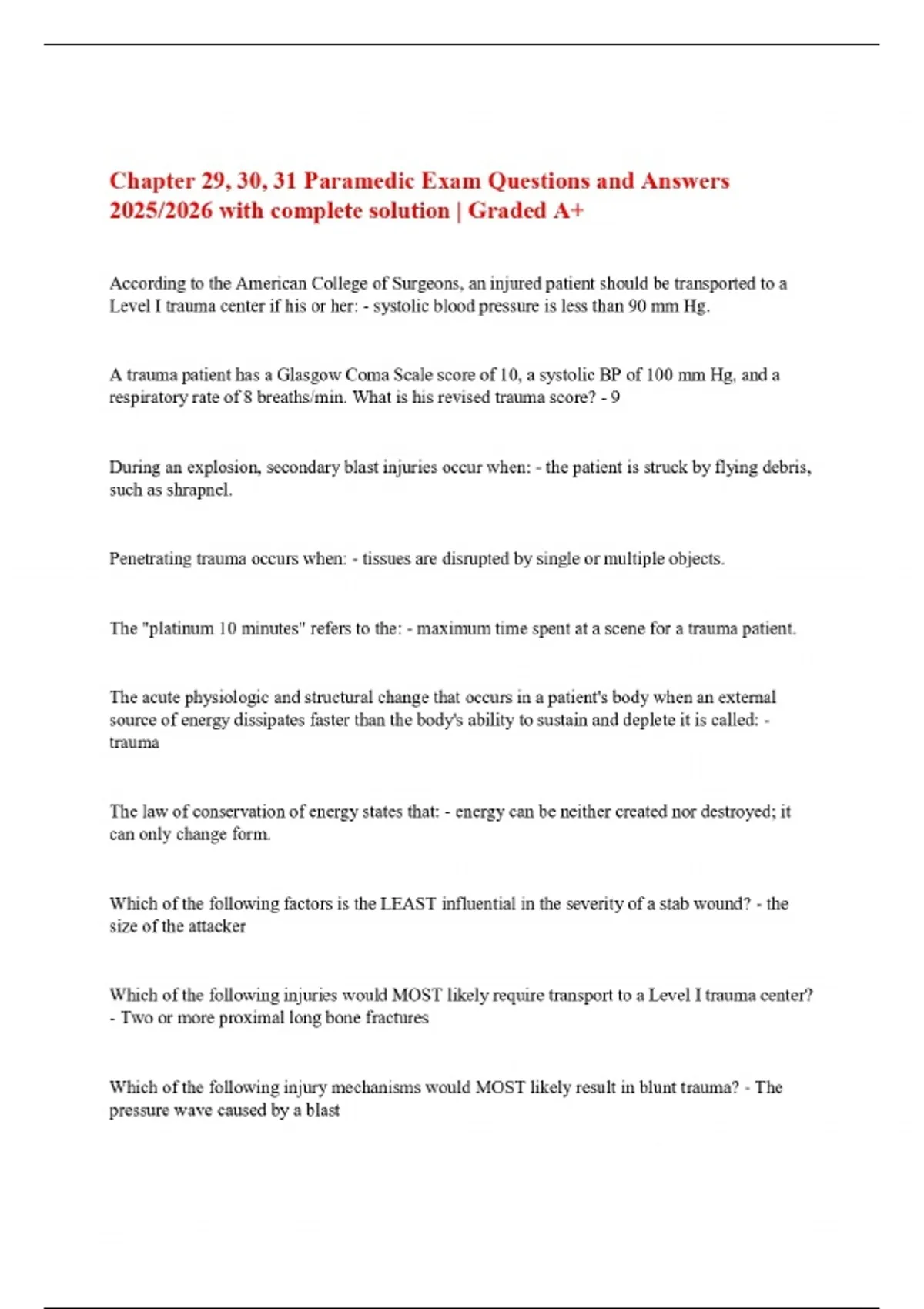 Chapter 29, 30, 31 Paramedic Exam Questions and Answers 2025/2026 with complete solution | Graded A+