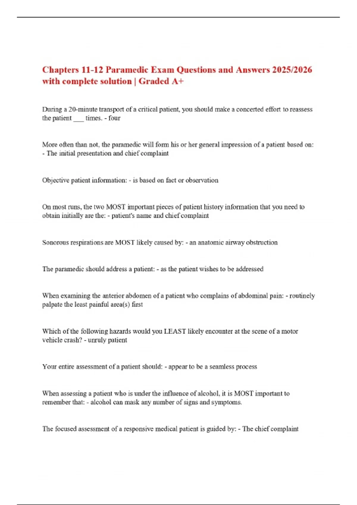 Chapters 11-12 Paramedic Exam Questions and Answers 2025/2026 with complete solution | Graded A+