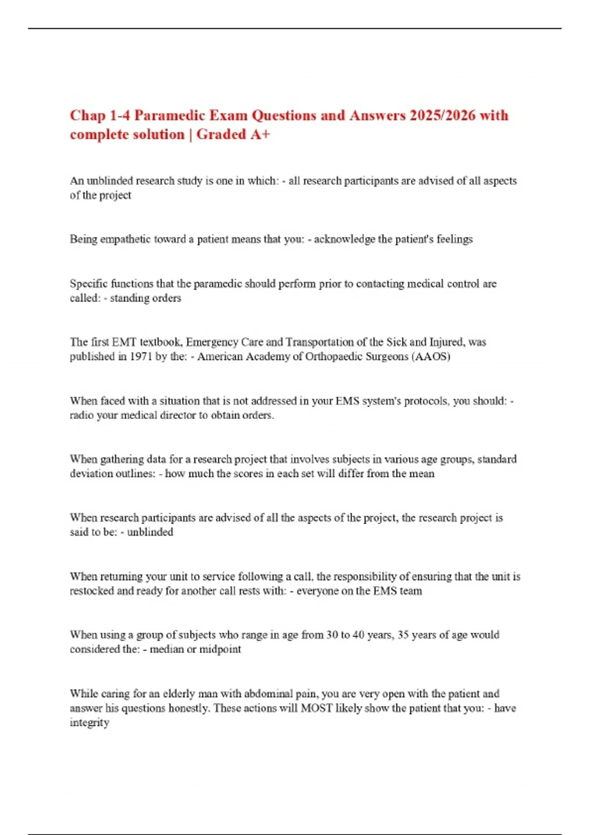 Chap 1-4 Paramedic Exam Questions and Answers 2025/2026 with complete solution | Graded A+