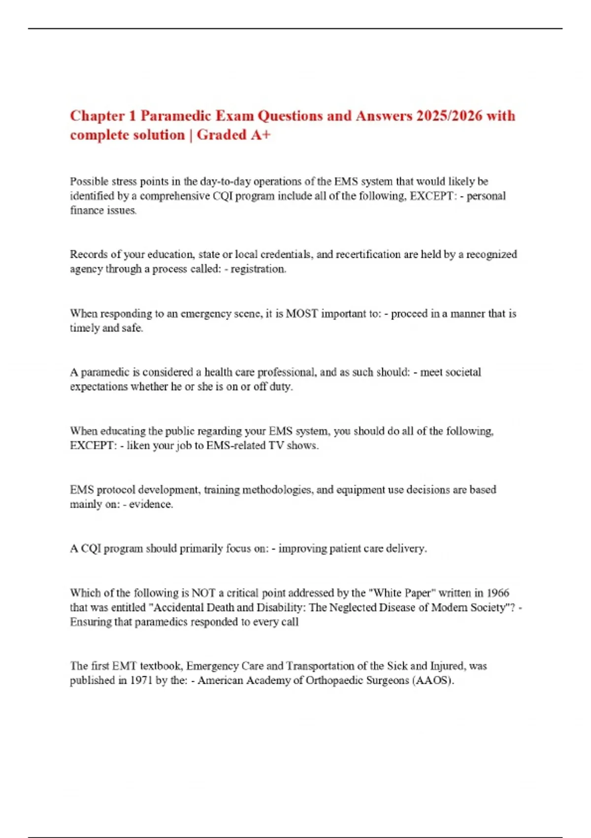 Chapter 1 Paramedic Exam Questions and Answers 2025/2026 with complete solution | Graded A+