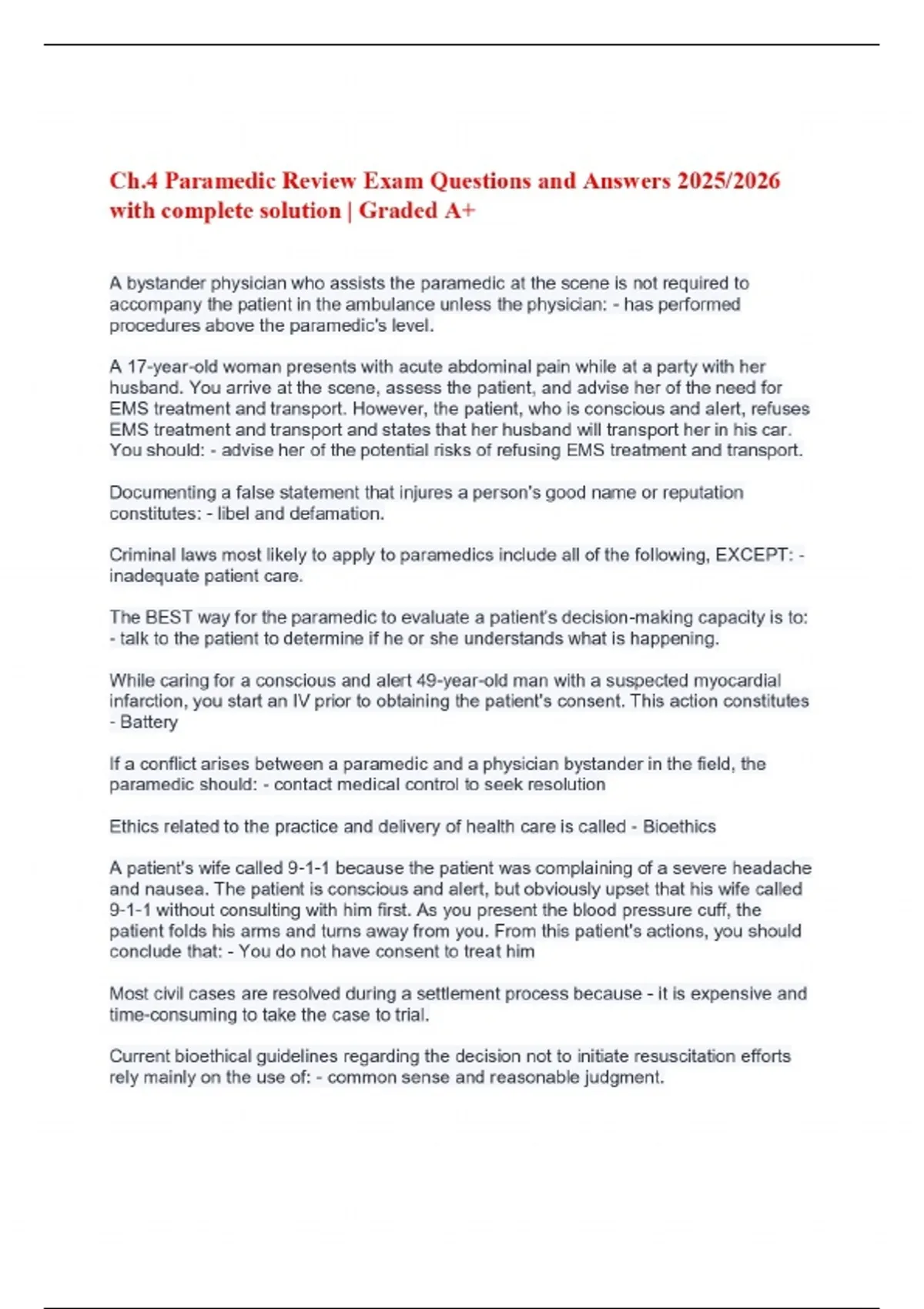 Ch.4 Paramedic Review Exam Questions and Answers 2025/2026 with complete solution | Graded A+