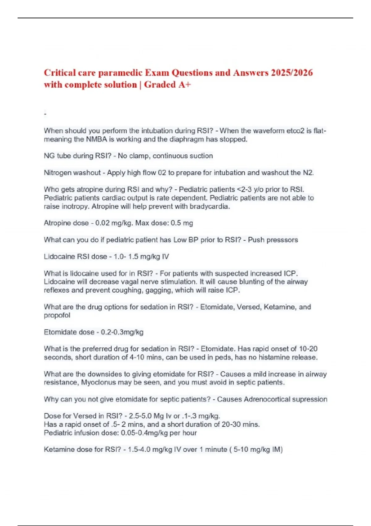 Critical care paramedic Exam Questions and Answers 2025/2026 with complete solution | Graded A+