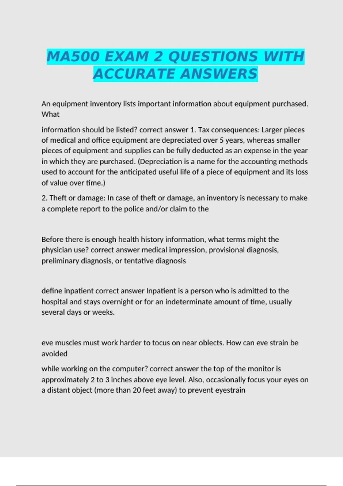 An equipment inventory lists important information about equipment purchased. What information should be listed? correct answer 1. Tax consequences: Larger pieces of medical and office equipment are depreciated over 5 years, whereas smaller pieces of equipment and supplies can be fully deducted as an expense in the year in which they are purchased. (Depreciation is a name for the accounting methods used to account for the anticipated useful life of a piece of equipment and its loss of value over time.) 2. Theft or damage: In case of theft or damage, an inventory is necessary to make a complete report to the police and/or claim to the Before there is enough health history information, what terms might the physician use? correct answer medical impression, provisional diagnosis, preliminary diagnosis, or tentative diagnosis define inpatient correct answer Inpatient is a person who is admitted to the hospital and stays overnight or for an indeterminate amount of time, usually several days or weeks. eve muscles must work harder to tocus on near oblects. How can eve strain be avoided while working on the computer? correct answer the top of the monitor is approximately 2 to 3 inches above eye level. Also, occasionally focus your eyes on a distant object (more than 20 feet away) to prevent eyestrain