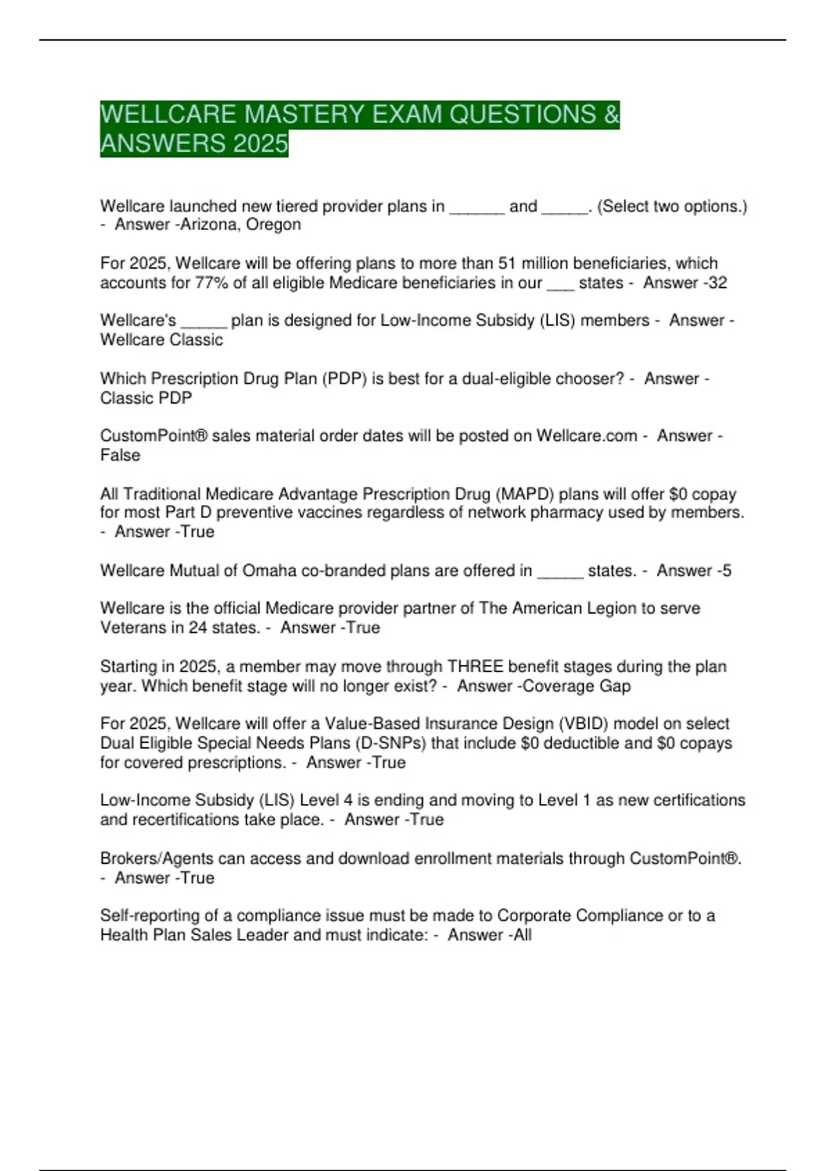 WELLCARE MASTERY EXAM QUESTIONS &