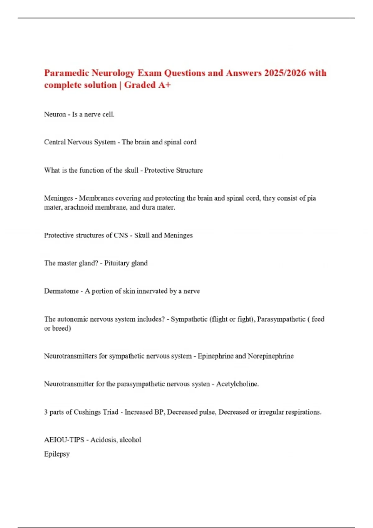 Paramedic Neurology Exam Questions and Answers 2025/2026 with complete solution | Graded A+