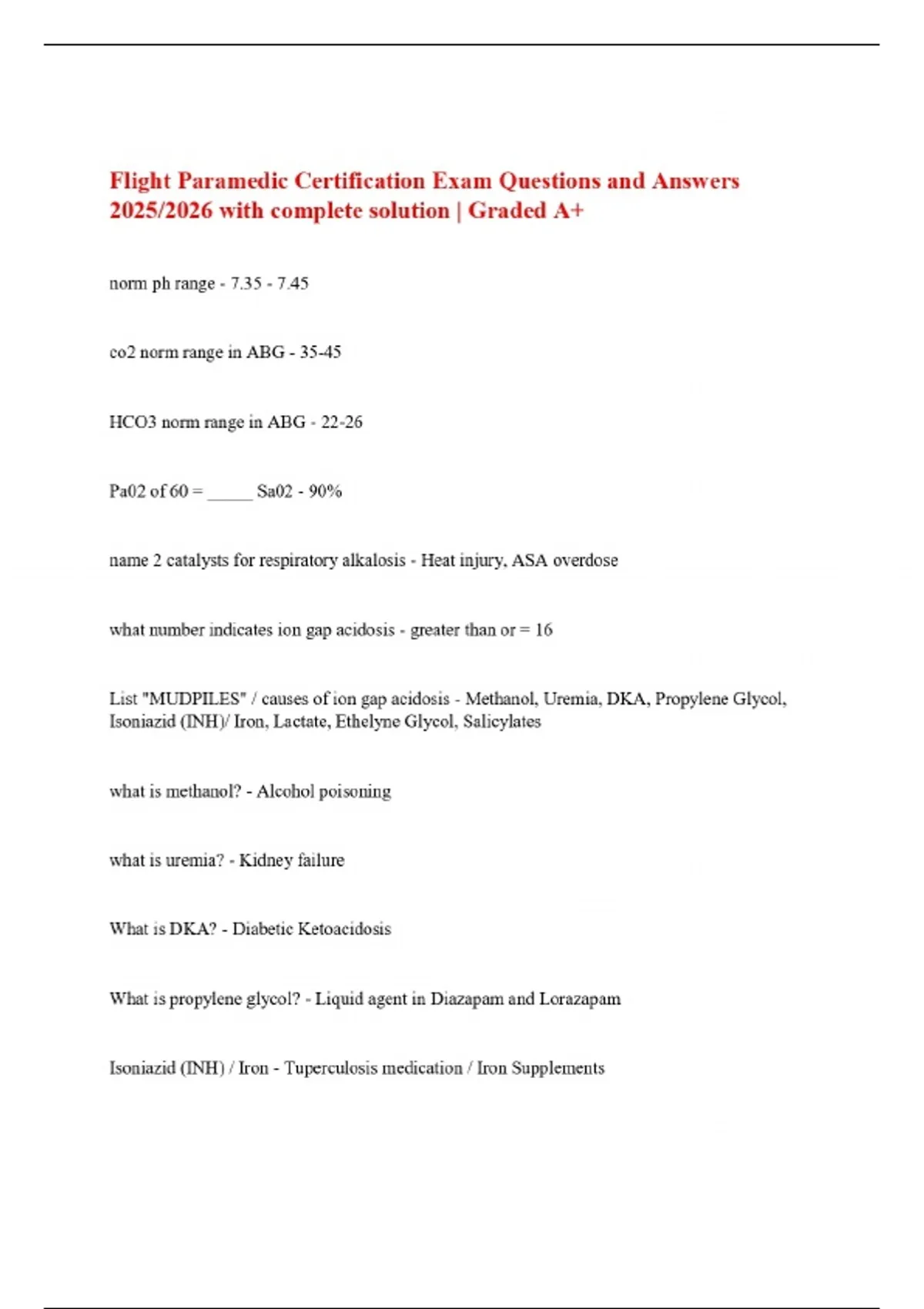 Flight Paramedic Certification Exam Questions and Answers 2025/2026 with complete solution | Graded A+