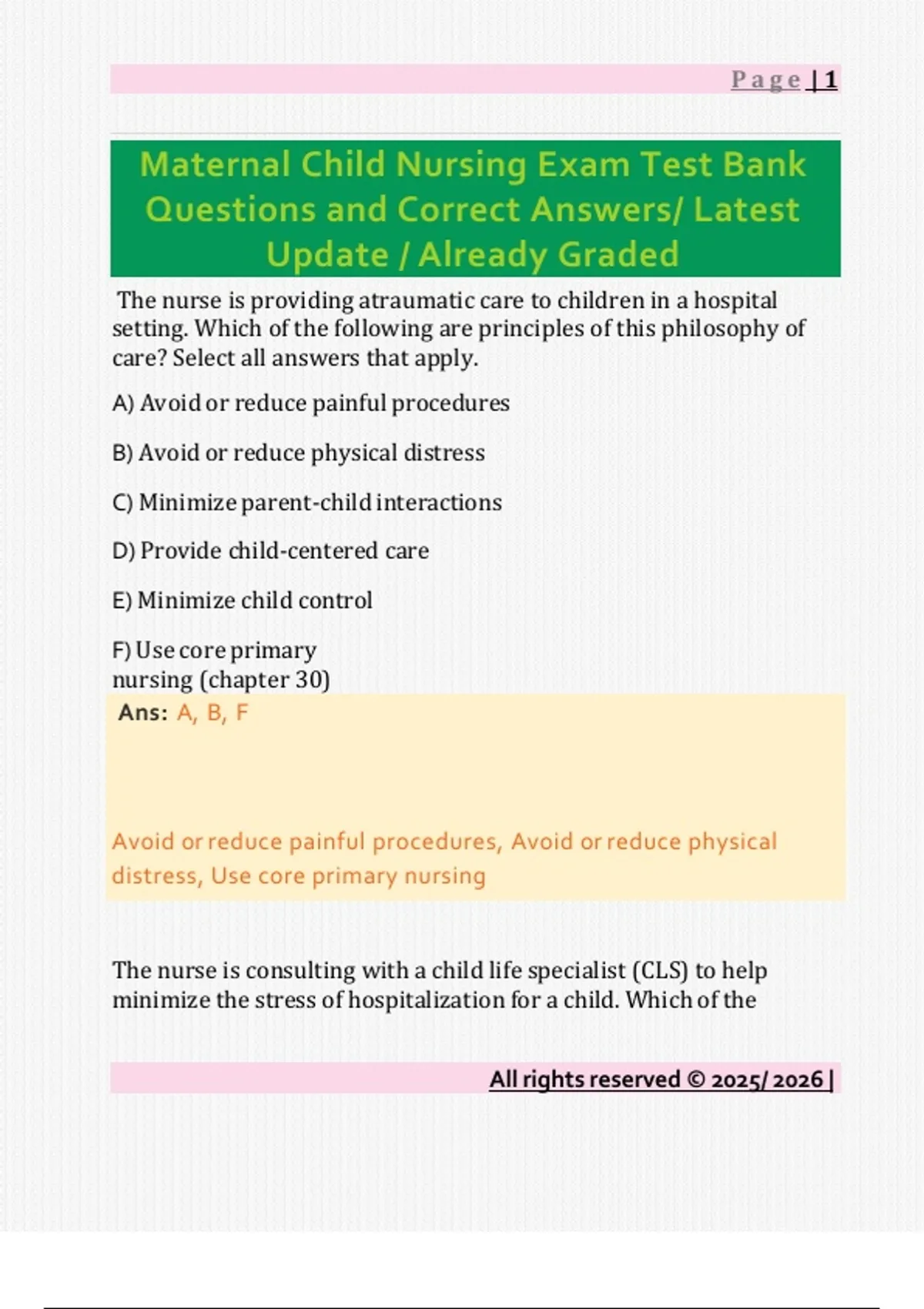 The Maternal Child Nursing Exam Test Bank provides accurate, real exam-style questions with correct verified answers. Designed to help nursing students master maternal and child health concepts, this resource strengthens exam readiness and clinical decision-making. Available on Stuvia, it ensures comprehensive review, clear explanations, and confidence for success in both academic and professional nursing exams.