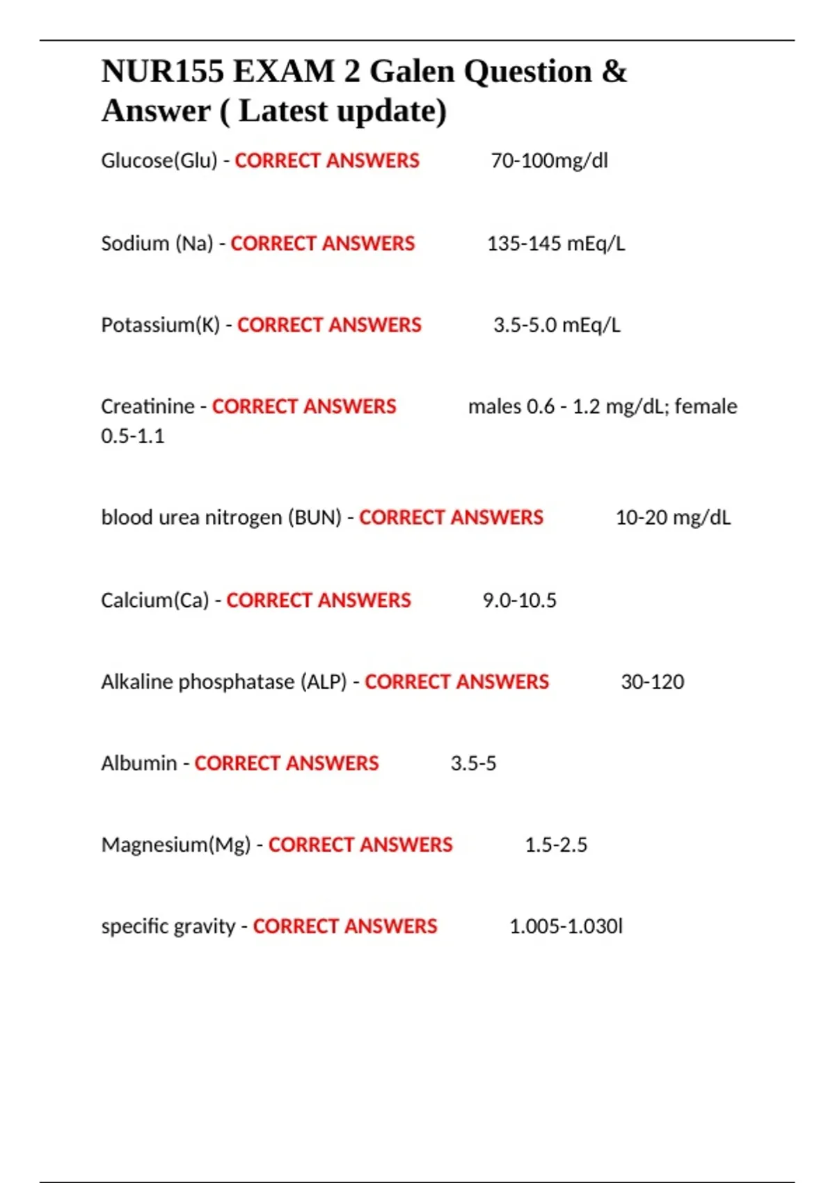 Creatinine - CORRECT ANSWERS ✔✔males 0.6 - 1.2 mg/dL; female