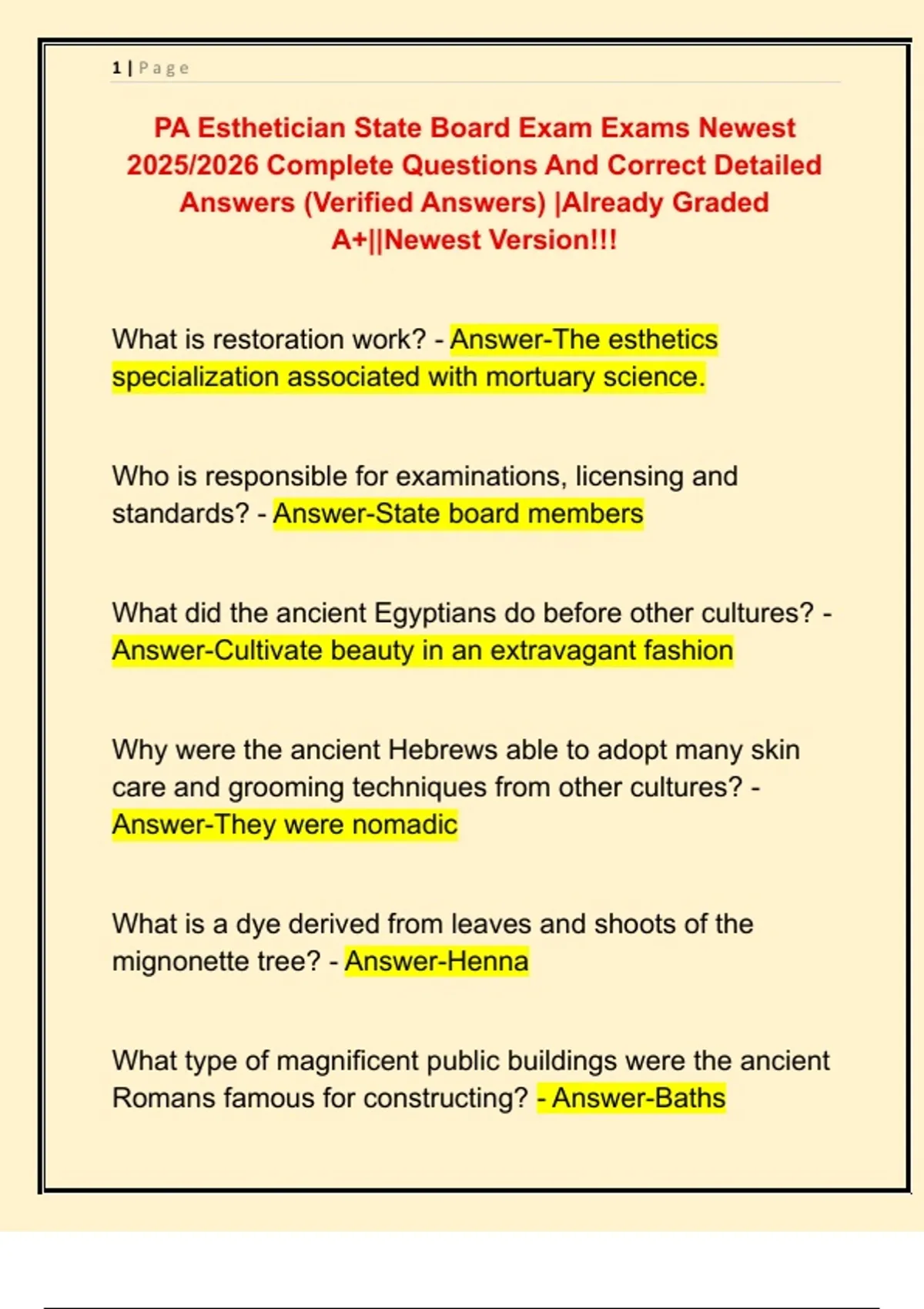 PA Esthetician State Board Exam Exams Newest 2025/2026 Complete Questions And Correct Detailed Answers (Verified Answers) |Already Graded A+||Newest Version!!!