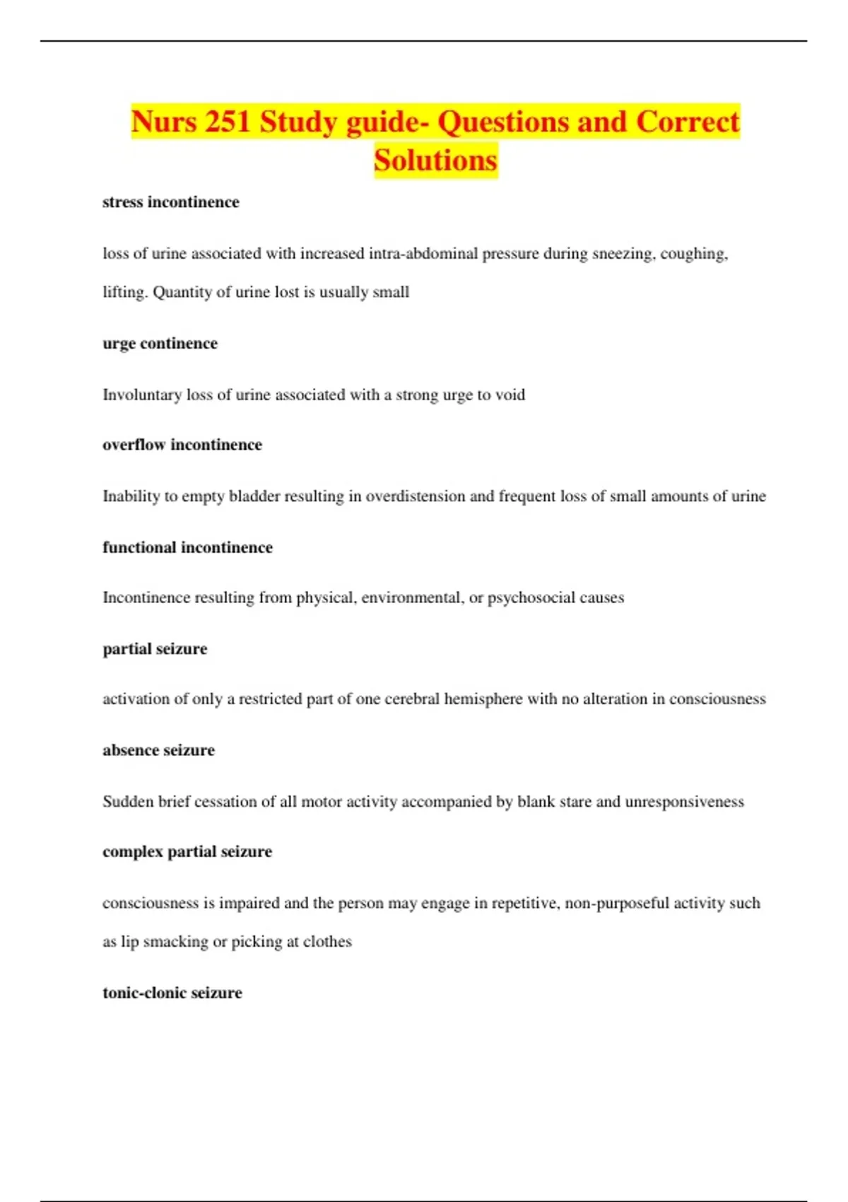 Nurs 251 Study guide- Questions and Correct