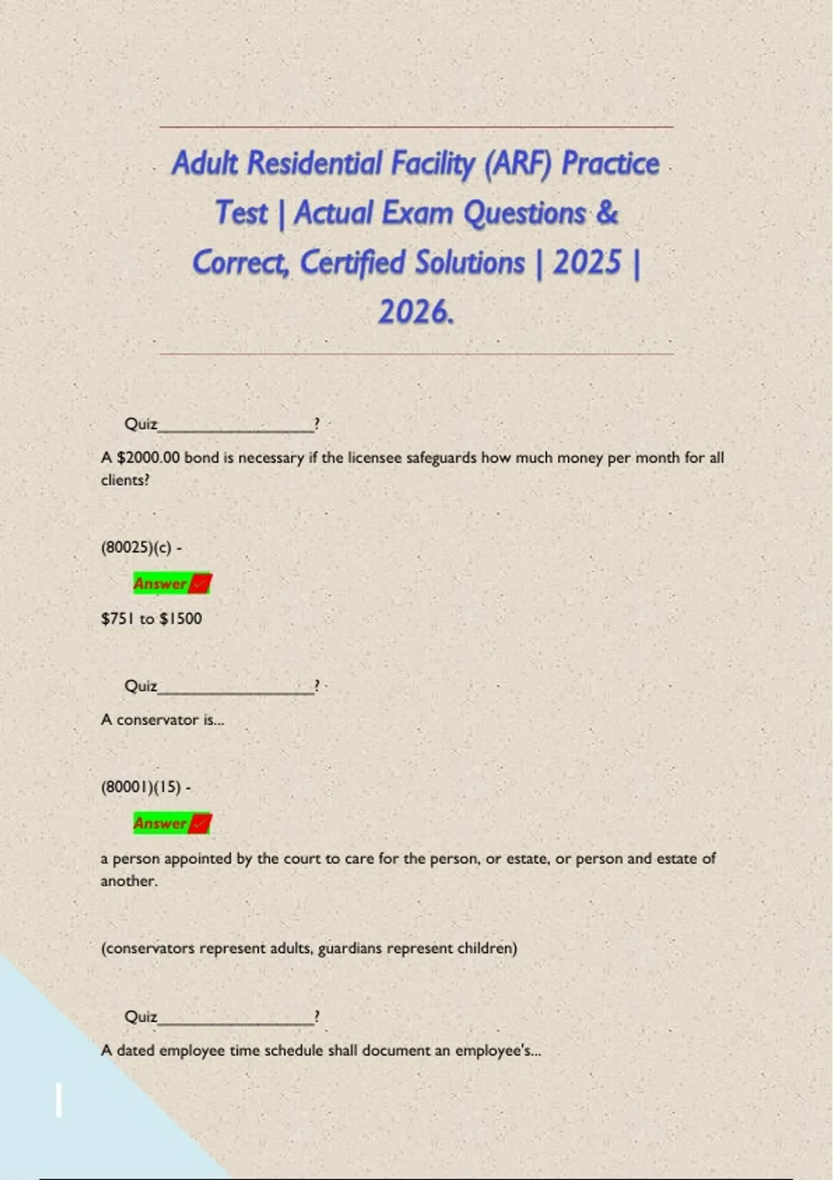 Adult Residential Facility (ARF) Practice Test | Actual Exam Questions & Correct, Certified Solutions | 2025 | 2026. Quiz_________________? A $2000.00 bond is necessary if the licensee safeguards how much money per month for all clients? (80025)(c) - Answer $751 to $1500 Quiz_________________? A conservator is... (80001)(15) - Answer a person appointed by the court to care for the person, or estate, or person and estate of another. (conservators represent adults, guardians represent children) Quiz_________________? A dated employee time schedule shall document an employee's... (85066)(b)(3) - Answer hours of work Quiz_________________? A licensee may request a review of a notice of deficiency within how many days of receipt of such notice? (80055)(a) - Answer 10 working days Quiz_________________? A non-transferrable written authorization issued by the licensing agency to use alternative means which meet the intent of the specific regulation and which are based on the unique needs or circumstances of a specific client(s)or staff person(s) is called what? (80001)(e)(6) - Answer An exception Quiz_________________? A supply of staple *nonperishable* food shall be maintained in the facility for a minimum of... (85076)(d)(1) - Answer One week/7 days Quiz_________________? A verbal report (phone call) shall be made to the licensing agency within the agency's next working day during its normal business hours. In addition, a written report containing the specific information shall be submitted to the licensing agency within how many days of the occurrences of any suspected physical or psychological abuse of any client to licensing? (80061)(B)(F) - Answer 7 days Quiz_________________? A written relocation plan to move a client from the facility shall not exceed how many days? (80078)(b)(1)(a) - Answer 30 days
