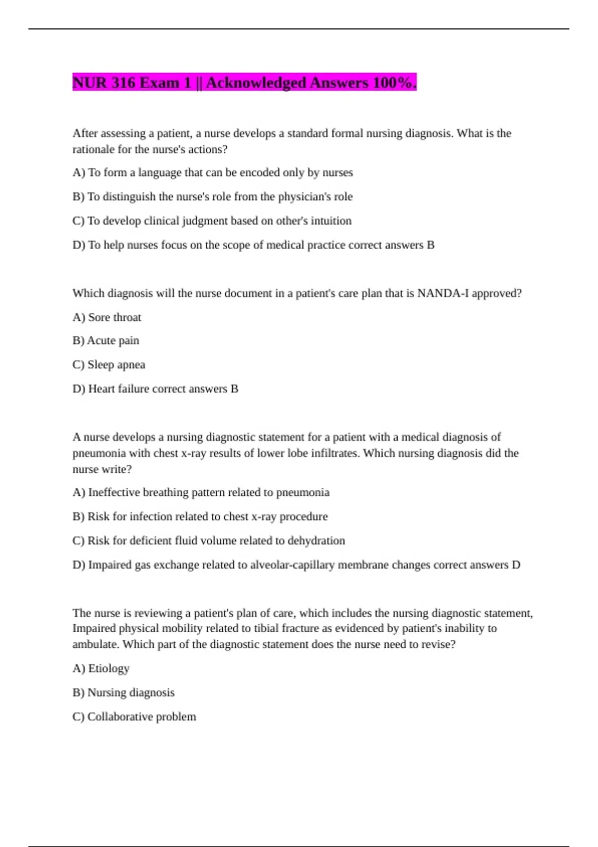 After assessing a patient, a nurse develops a standard formal nursing diagnosis. What is the rationale for the nurse's actions? A) To form a language that can be encoded only by nurses B) To distinguish the nurse's role from the physician's role C) To develop clinical judgment based on other's intuition D) To help nurses focus on the scope of medical practice correct answers B Which diagnosis will the nurse document in a patient's care plan that is NANDA-I approved? A) Sore throat B) Acute pain C) Sleep apnea D) Heart failure correct answers B A nurse develops a nursing diagnostic statement for a patient with a medical diagnosis of pneumonia with chest x-ray results of lower lobe infiltrates. Which nursing diagnosis did the nurse write? A) Ineffective breathing pattern related to pneumonia B) Risk for infection related to chest x-ray procedure C) Risk for deficient fluid volume related to dehydration D) Impaired gas exchange related to alveolar-capillary membrane changes correct answers D The nurse is reviewing a patient's plan of care, which includes the nursing diagnostic statement, Impaired physical mobility related to tibial fracture as evidenced by patient's inability to ambulate. Which part of the diagnostic statement does the nurse need to revise? A) Etiology B) Nursing diagnosis