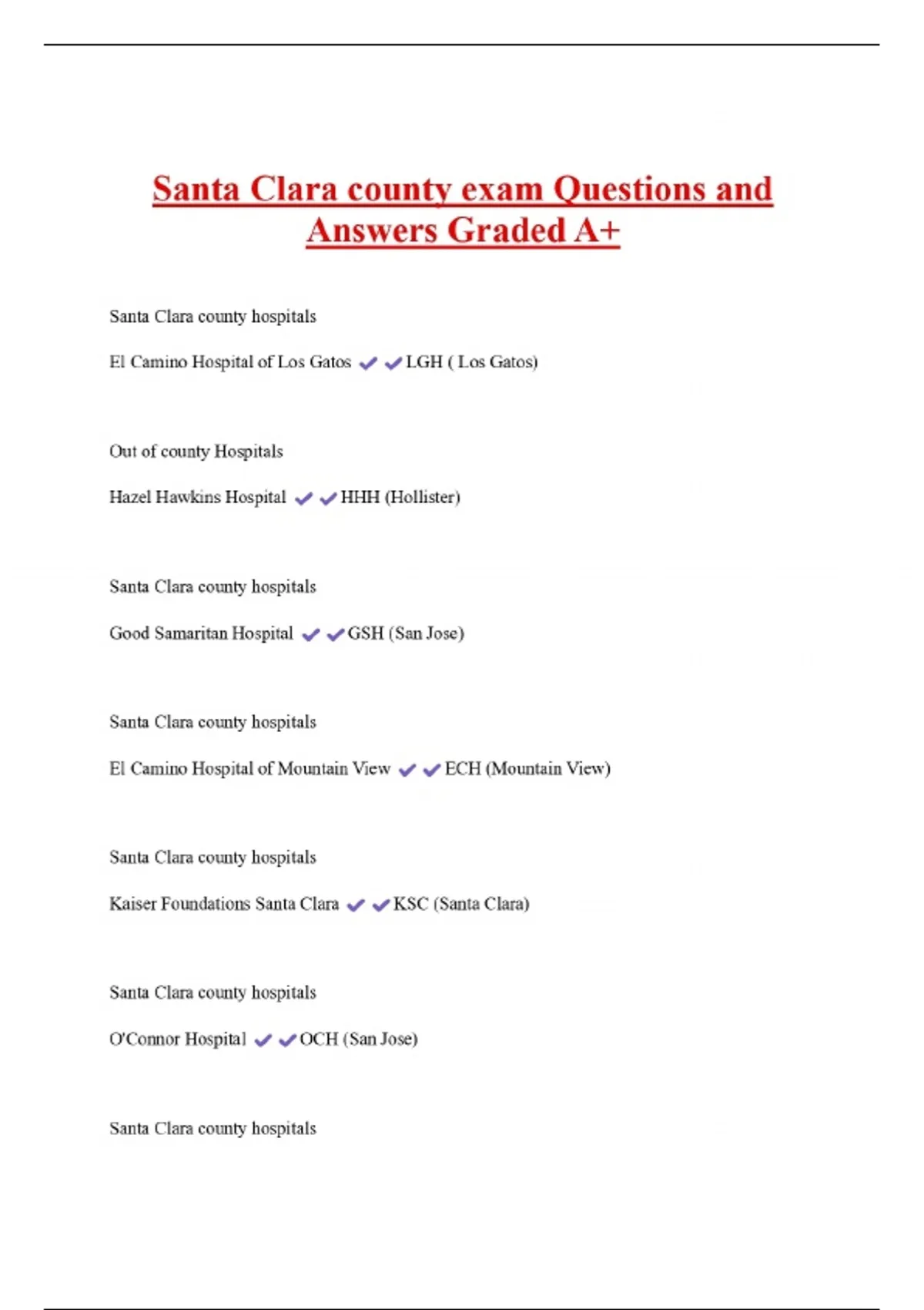 Santa Clara county exam Questions and Answers Graded A+ Santa Clara county hospitals El Camino Hospital of Los Gatos Out of county Hospitals Hazel Hawkins Hospital LGH ( Los Gatos) HHH (Hollister) Santa Clara county hospitals Good Samaritan Hospital Santa Clara county hospitals GSH (San Jose) El Camino Hospital of Mountain View Santa Clara county hospitals Kaiser Foundations Santa Clara Santa Clara county hospitals O'Connor Hospital OCH (San Jose) ECH (Mountain View)