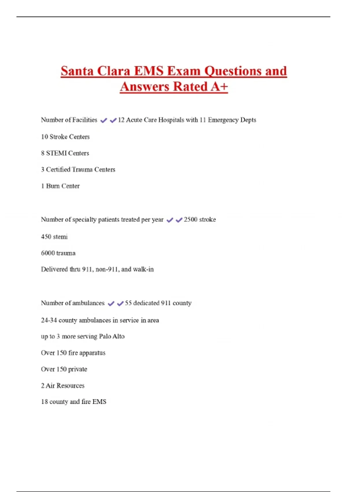 Santa Clara EMS Exam Questions and Answers Rated A+ Number of Facilities 10 Stroke Centers 8 STEMI Centers 3 Certified Trauma Centers 1 Burn Center 12 Acute Care Hospitals with 11 Emergency Depts Number of specialty patients treated per year 450 stemi 6000 trauma Delivered thru 911, non-911, and walk-in