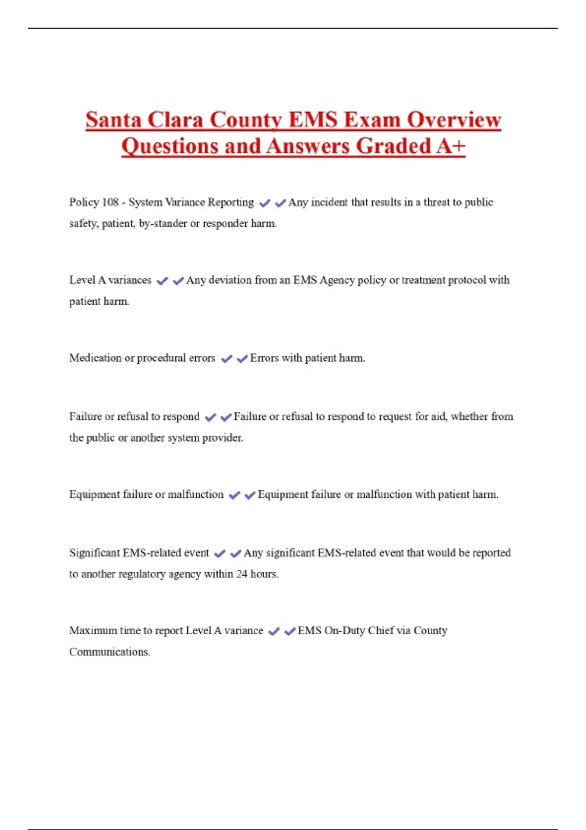 Santa Clara County EMS Exam Overview Questions and Answers Graded A+ Policy 108 - System Variance Reporting safety, patient, by-stander or responder harm. Level A variances Any incident that results in a threat to public Any deviation from an EMS Agency policy or treatment protocol with patient harm. Medication or procedural errors Failure or refusal to respond the public or another system provider. Equipment failure or malfunction Significant EMS-related event Errors with patient harm. Failure or refusal to respond to request for aid, whether from Equipment failure or malfunction with patient harm.