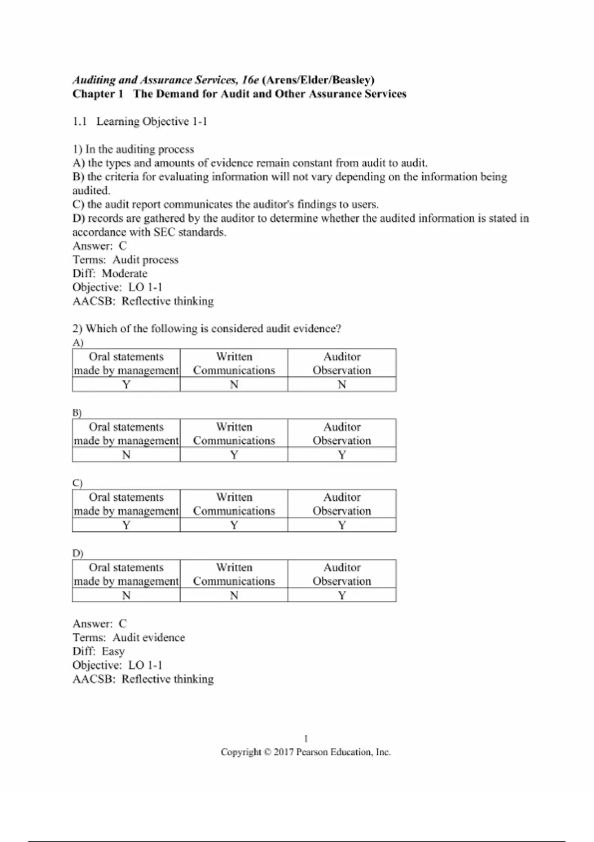 The Test Bank for Auditing and Assurance Services: An Integrated Approach, 16th Edition by Arens, Elder, Beasley, and Hogan (ISBN 9781292147871) provides an extensive set of assessment items precisely aligned to the textbook’s official Table of Contents as listed on Pearson and related academic sources. It includes multiple-choice, true/false, short-answer, matching, and problem-based questions, designed to test students’ grasp of auditing theory, practical procedures, risk assessment, internal control, cycles of business, ethics, legal liability, and assurance engagements. The content is structured following the verified TOC: Chapter 1: The Demand for Audit and Other Assurance Services; Chapter 2: The CPA Profession; Chapter 3: Audit Reports; Chapter 4: Professional Ethics; Chapter 5: Legal Liability; Chapter 6: Audit Responsibilities and Objectives; Chapter 7: Audit Evidence; Chapter 8: Audit Planning and Materiality; Chapter 9: Assessing the Risk of Material Misstatement; Chapter 10: Assessing and Responding to Fraud Risks; Chapter 11: Internal Control and the COSO Framework; Chapter 12: Assessing Control Risk and Reporting on Internal Controls; Chapter 13: Overall Audit Strategy and Audit Program; Chapter 14: Audit of the Sales and Collection Cycle: Tests of Controls and Substantive Tests of Transactions; Chapter 15: Audit Sampling for Tests of Controls and Substantive Tests of Transactions; Chapter 16: Completing the Tests in the Sales and Collection Cycle: Accounts Receivable; Chapter 17: Audit Sampling for Tests of Details of Balances; Chapter 18: Audit of the Acquisition and Payment Cycle: Tests of Controls, Substantive Tests of Transactions, and Accounts Payable; Chapter 19: Completing the Tests in the Acquisition and Payment Cycle: Verification of Selected Accounts; Chapter 20: Audit of the Payroll and Personnel Cycle; Chapter 21: Audit of the Inventory and Warehouse Cycle; Chapter 22: Audit of the Capital Acquisition and Repayment Cycle; Chapter 23: Audit of Cash and Financial Instruments; Chapter 24: Completing the Audit; Chapter 25: Other Assurance Services; Chapter 26: Internal and Governmental Financial Auditing and Operational Auditing.
