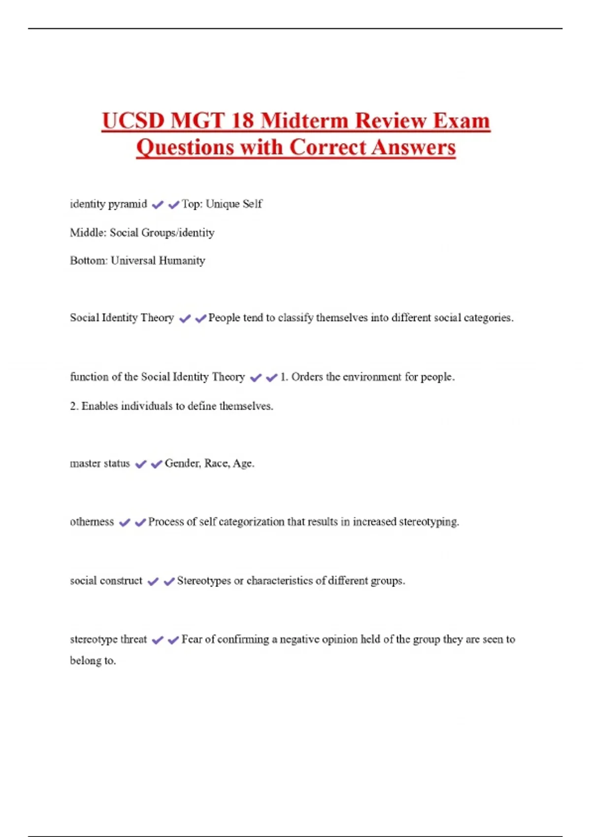 UCSD MGT 18 Midterm Review Exam Questions with Correct Answers identity pyramid Top: Unique Self Middle: Social Groups/identity Bottom: Universal Humanity Social Identity Theory People tend to classify themselves into different social categories. function of the Social Identity Theory 2. Enables individuals to define themselves. master status otherness Gender, Race, Age. 1. Orders the environment for people. Process of self categorization that results in increased stereotyping. social construct stereotype threat belong to. Stereotypes or characteristics of different groups.