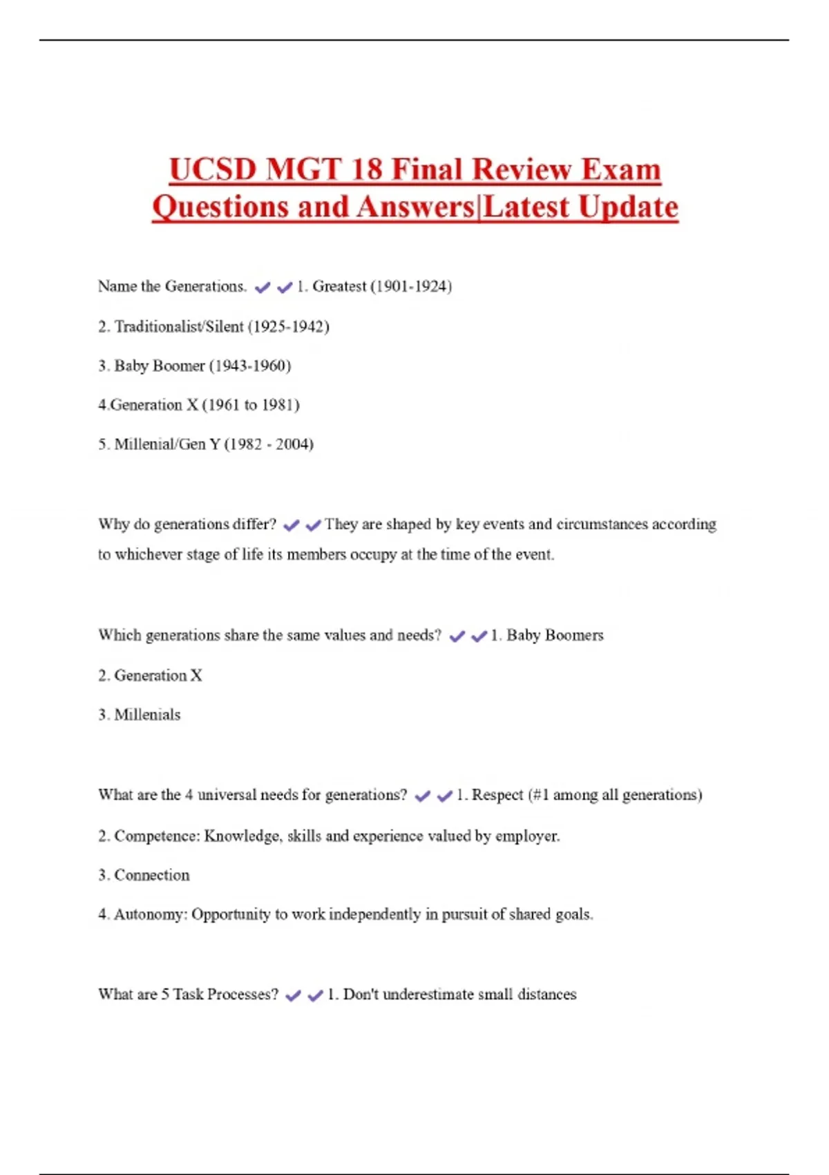 UCSD MGT 18 Final Review Exam Questions and Answers|Latest Update Name the Generations. 1. Greatest () 2. Traditionalist/Silent () 3. Baby Boomer () 4.Generation X (1961 to 1981) 5. Millenial/Gen Y () Why do generations differ? They are shaped by key events and circumstances according to whichever stage of life its members occupy at the time of the event. Which generations share the same values and needs? 2. Generation X 3. Millenials