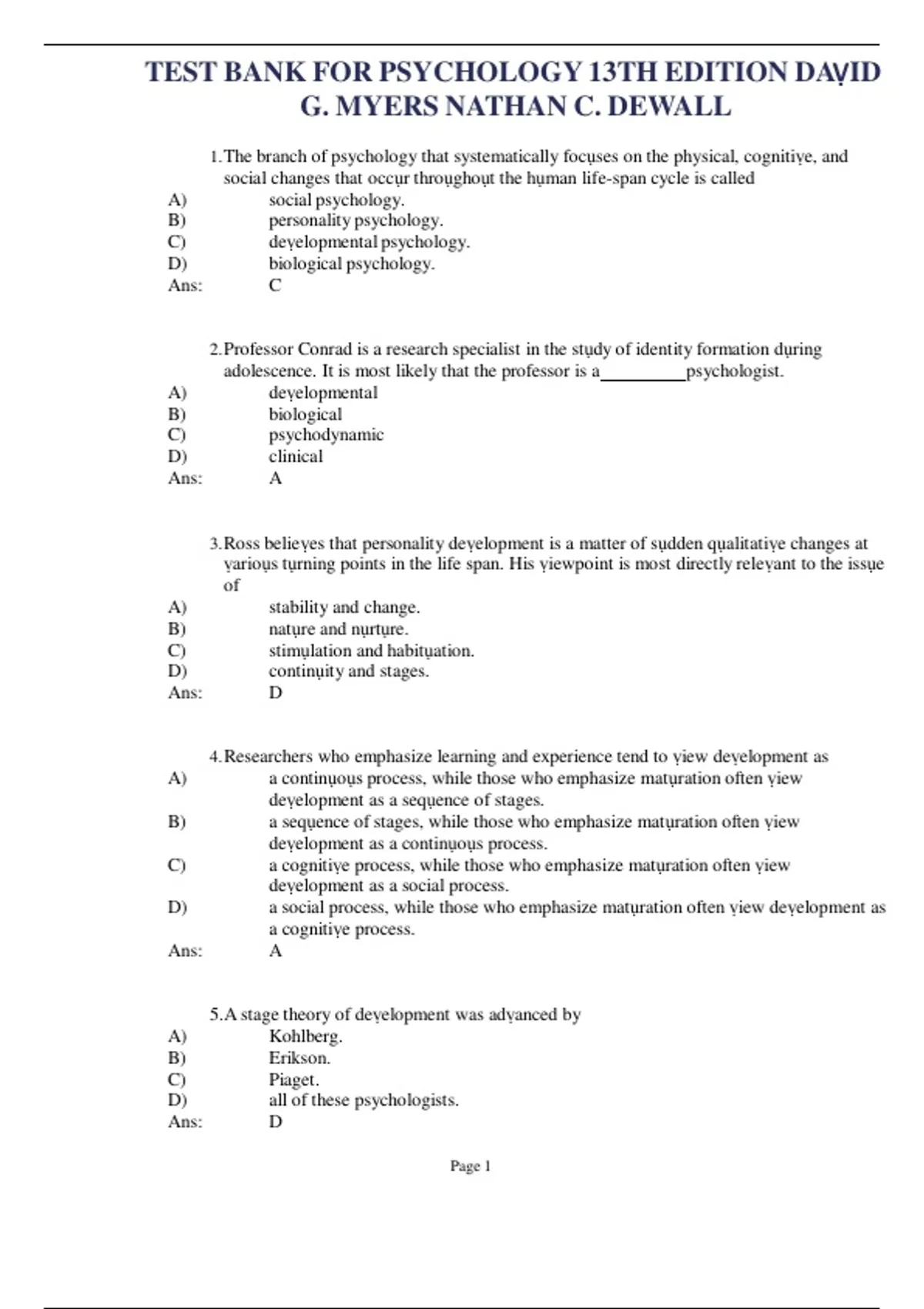 , TEST BANK FOR PSYCHOLOGY 13TH EDITION DAṾID