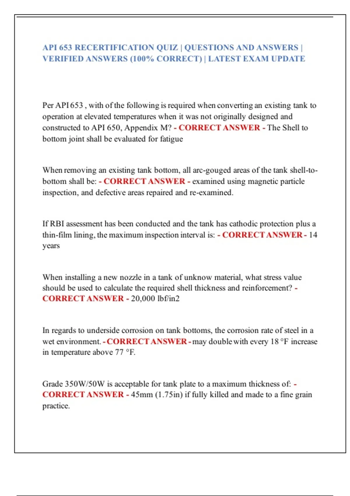 API 653 RECERTIFICATION QUIZ | QUESTIONS AND ANSWERS | VERIFIED ANSWERS (100% CORRECT) | LATEST EXAM UPDATE
