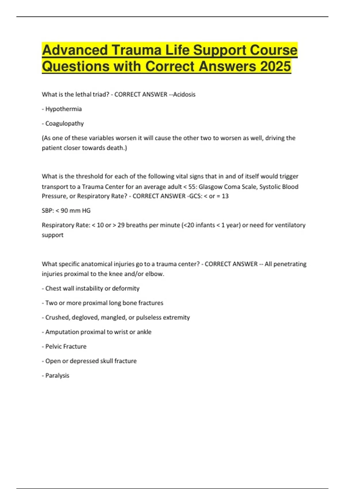 Advanced Trauma Life Support Course Questions with Correct Answers 2025