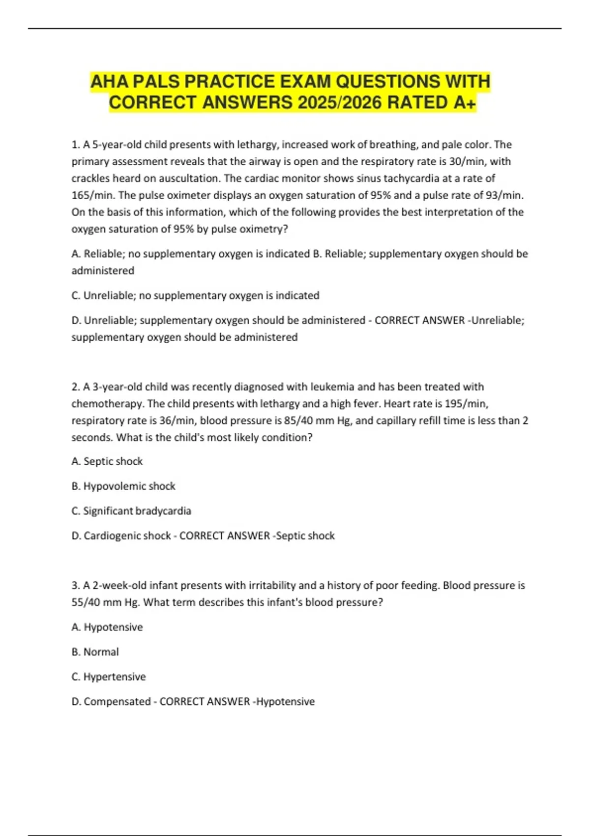 AHA PALS PRACTICE EXAM QUESTIONS WITH CORRECT ANSWERS 2025/2026 RATED A+