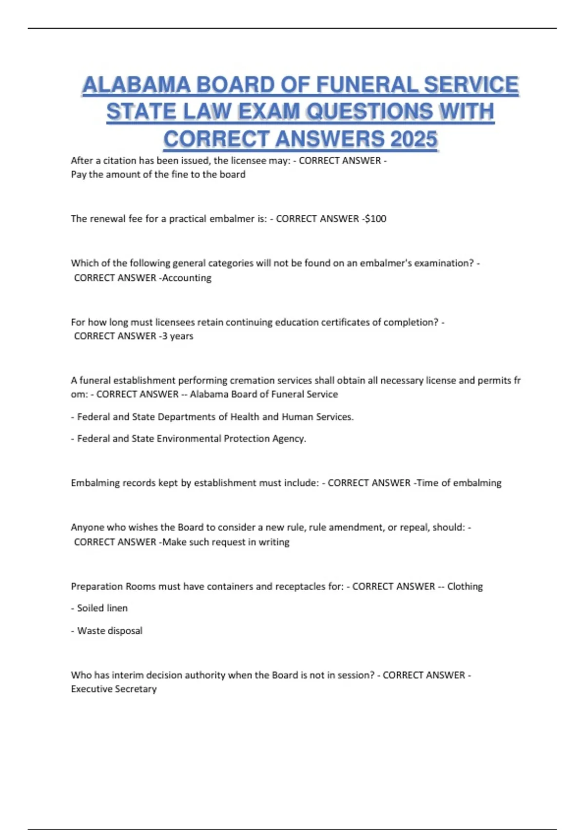 ALABAMA BOARD OF FUNERAL SERVICE STATE LAW EXAM QUESTIONS WITH CORRECT ANSWERS 2025