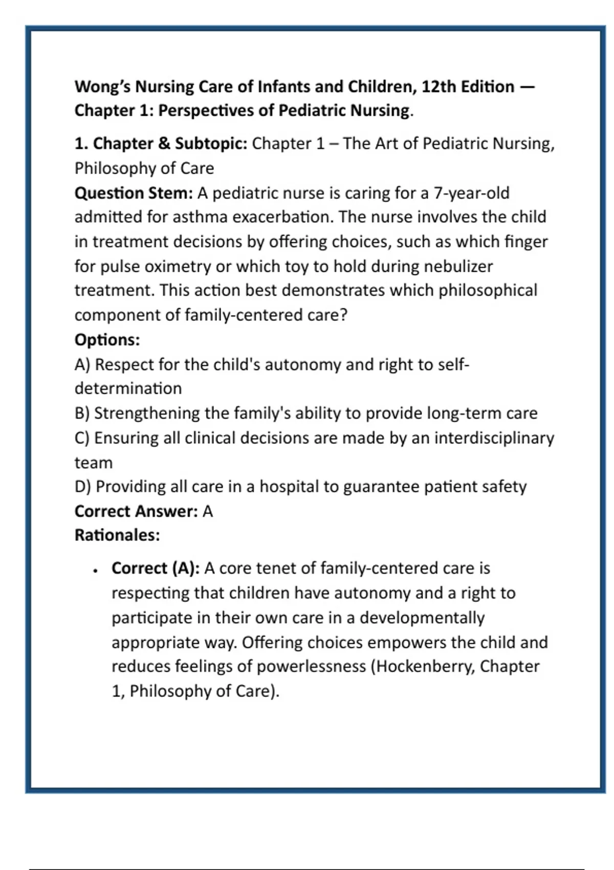 • Correct (A): A core tenet of family-centered care is