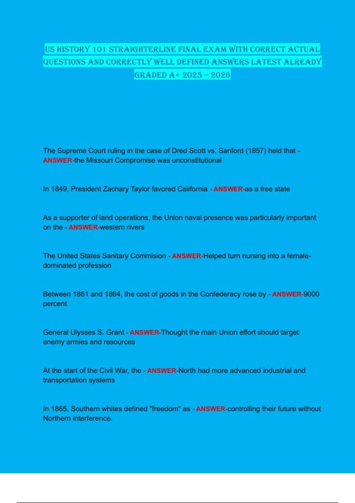US HISTORY 101 STRAIGHTERLINE FINAL EXAM WITH CORRECT ACTUAL
