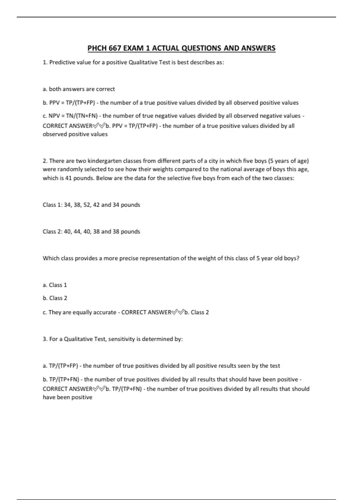 PHCH 667 EXAM 1 ACTUAL QUESTIONS AND ANSWERS 1. Predictive value for a positive Qualitative Test is best describes as: a. both answers are correct b. PPV = TP/(TP+FP) - the number of a true positive values divided by all observed positive values c. NPV = TN/(TN+FN) - the number of true negative values divided by all observed negative values - CORRECT ANSWERb. PPV = TP/(TP+FP) - the number of a true positive values divided by all observed positive values