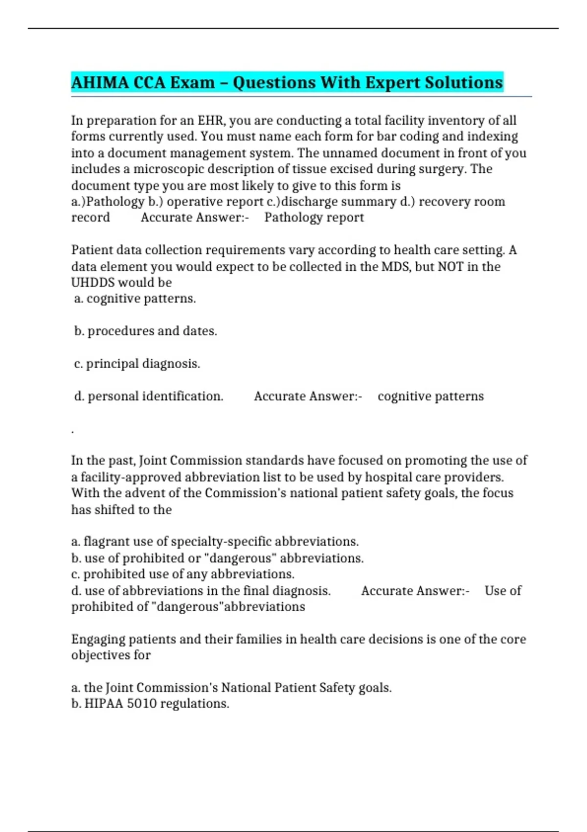 AHIMA CCA Exam – Questions With Expert Solutions