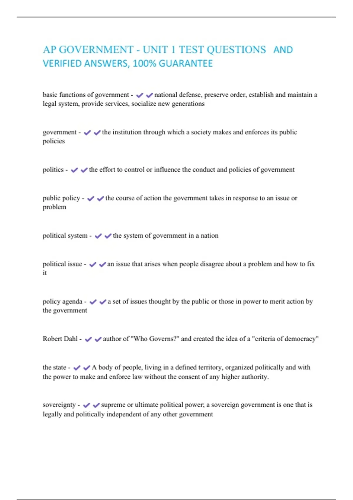 AP GOVERNMENT - UNIT 1 TEST QUESTIONS AND