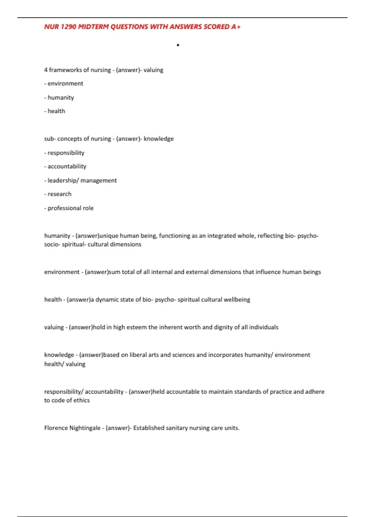 NUR 1290 MIDTERM QUESTIONS WITH ANSWERS SCORED A+