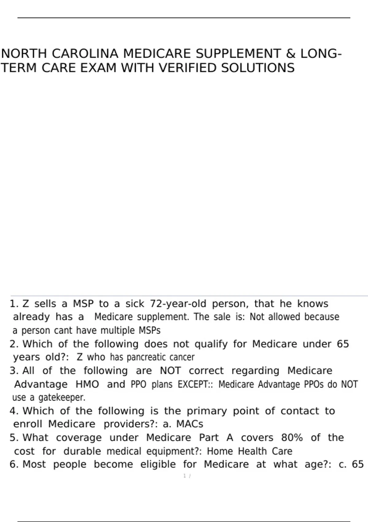 North Carolina Medicare Supplement & Long-term Care exam with verified solutions