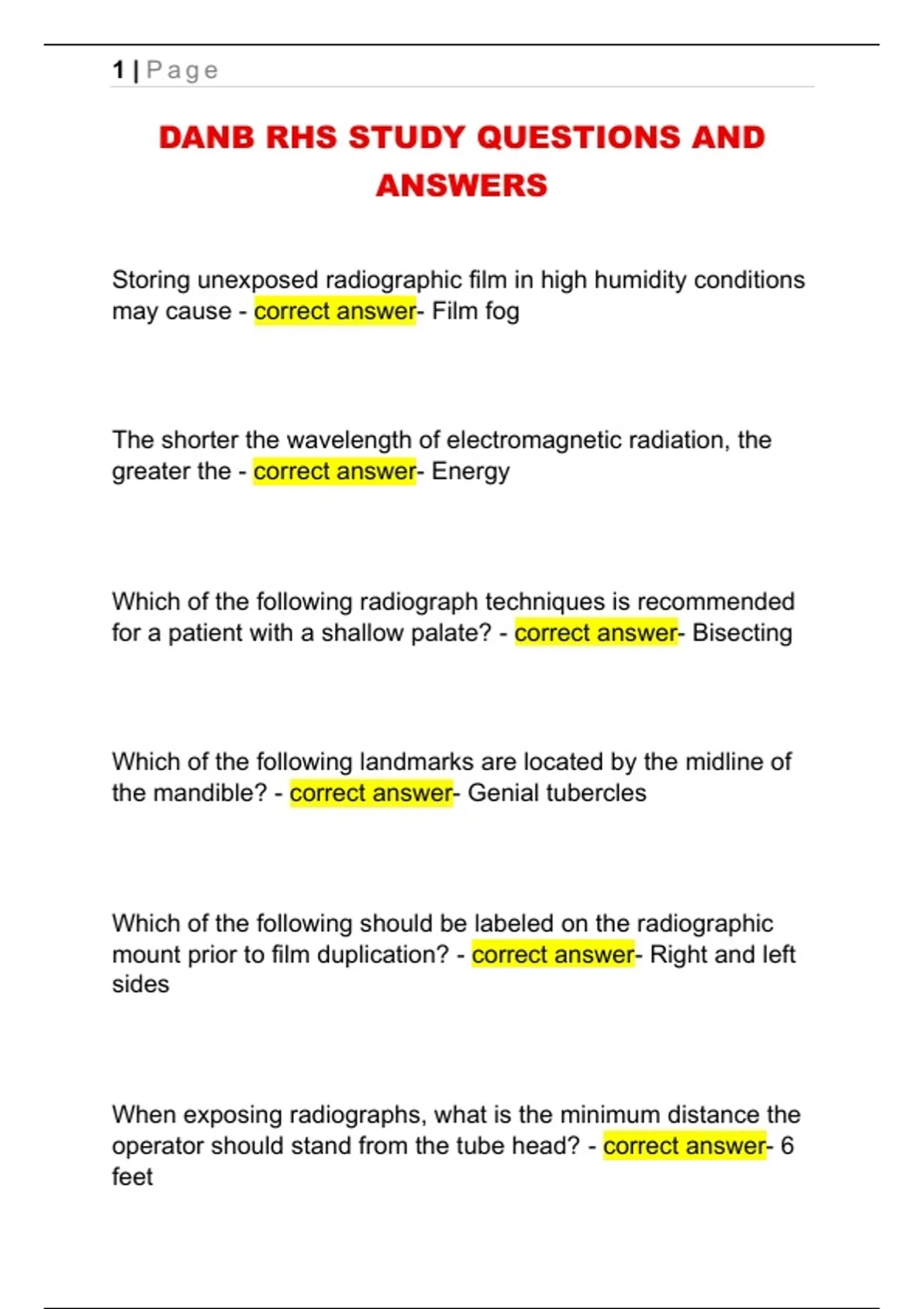 DANB RHS STUDY QUESTIONS AND ANSWERS