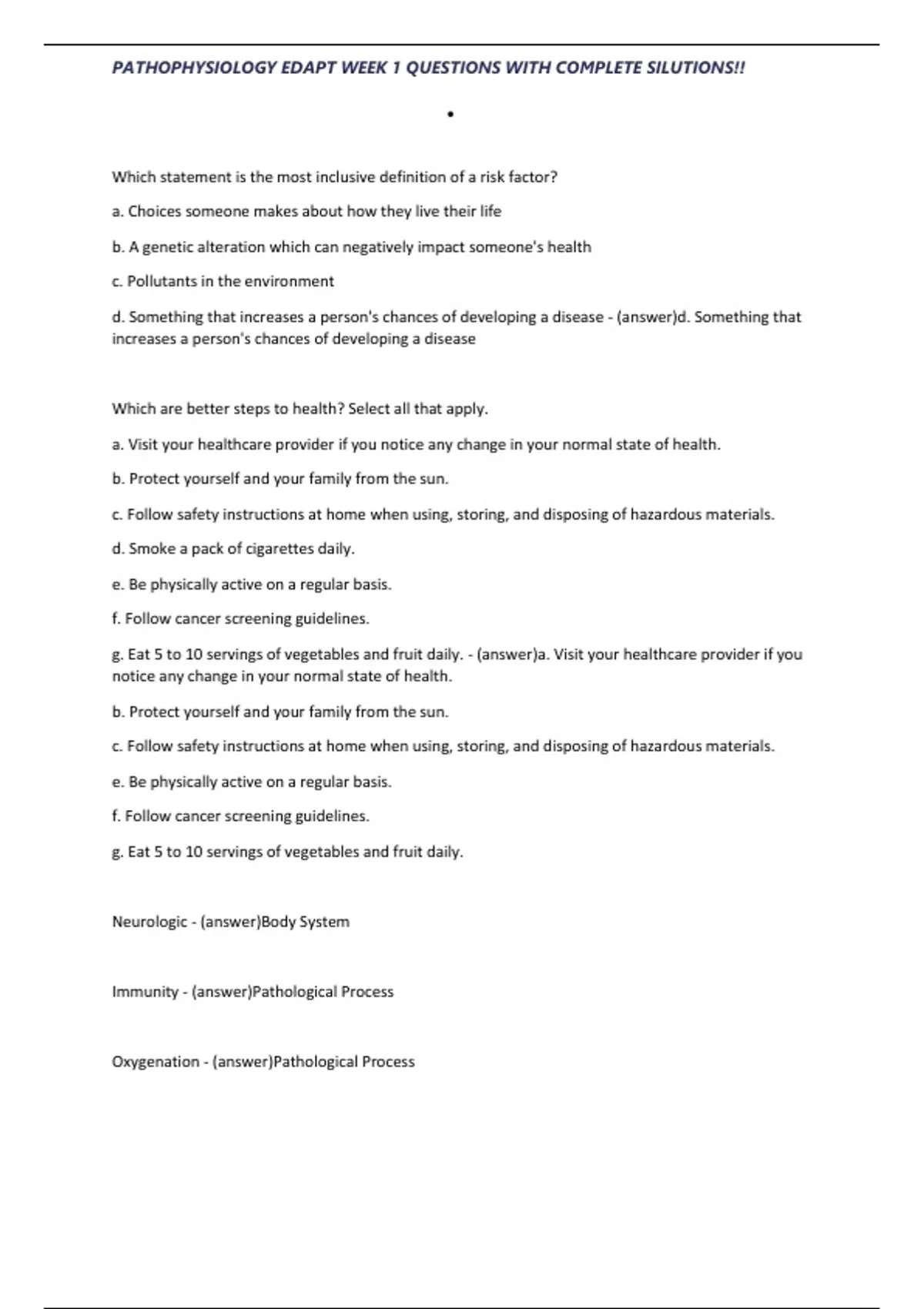 , PATHOPHYSIOLOGY EDAPT WEEK 1 QUESTIONS WITH COMPLETE SILUTIONS!!