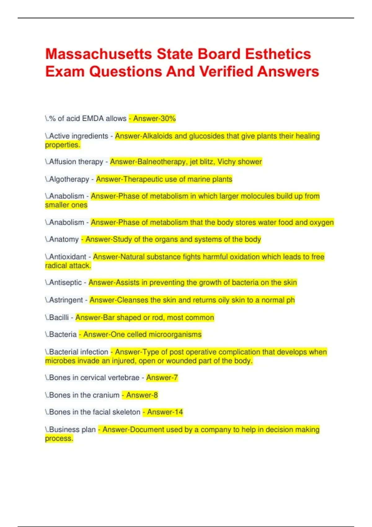 Massachusetts State Board Esthetics Exam Questions And Verified Answers .% of acid EMDA allows - Answer-30% .Active ingredients - Answer-Alkaloids and glucosides that give plants their healing properties. .Affusion therapy - Answer-Balneotherapy, jet blitz, Vichy shower .Algotherapy - Answer-Therapeutic use of marine plants .Anabolism - Answer-Phase of metabolism in which larger molocules build up from smaller ones .Anabolism - Answer-Phase of metabolism that the body stores water food and oxygen .Anatomy - Answer-Study of the organs and systems of the body .Antioxidant - Answer-Natural substance fights harmful oxidation which leads to free radical attack. .Antiseptic - Answer-Assists in preventing the growth of bacteria on the skin .Astringent - Answer-Cleanses the skin and returns oily skin to a normal ph .Bacilli - Answer-Bar shaped or rod, most common .Bacteria - Answer-One celled microorganisms .Bacterial infection - Answer-Type of post operative complication that develops when microbes invade an injured, open or wounded part of the body. .Bones in cervical vertebrae - Answer-7 .Bones in the cranium - Answer-8 .Bones in the facial skeleton - Answer-14 .Business plan - Answer-Document used by a company to help in decision making process.
