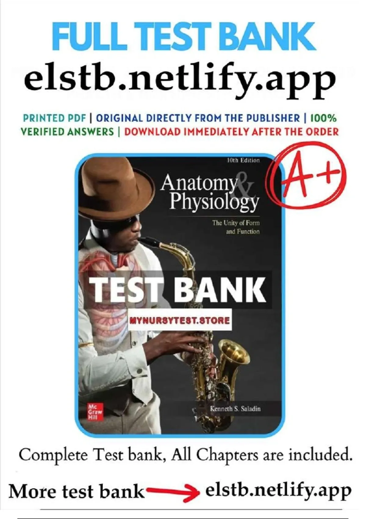 This document provides the complete test bank for Anatomy and Physiology: The Unity of Form and Function by Saladin, 10th Edition. It covers all chapters with a wide range of exam-style questions and answers. Perfect for students preparing for tests, quizzes, and final exams with this textbook edition