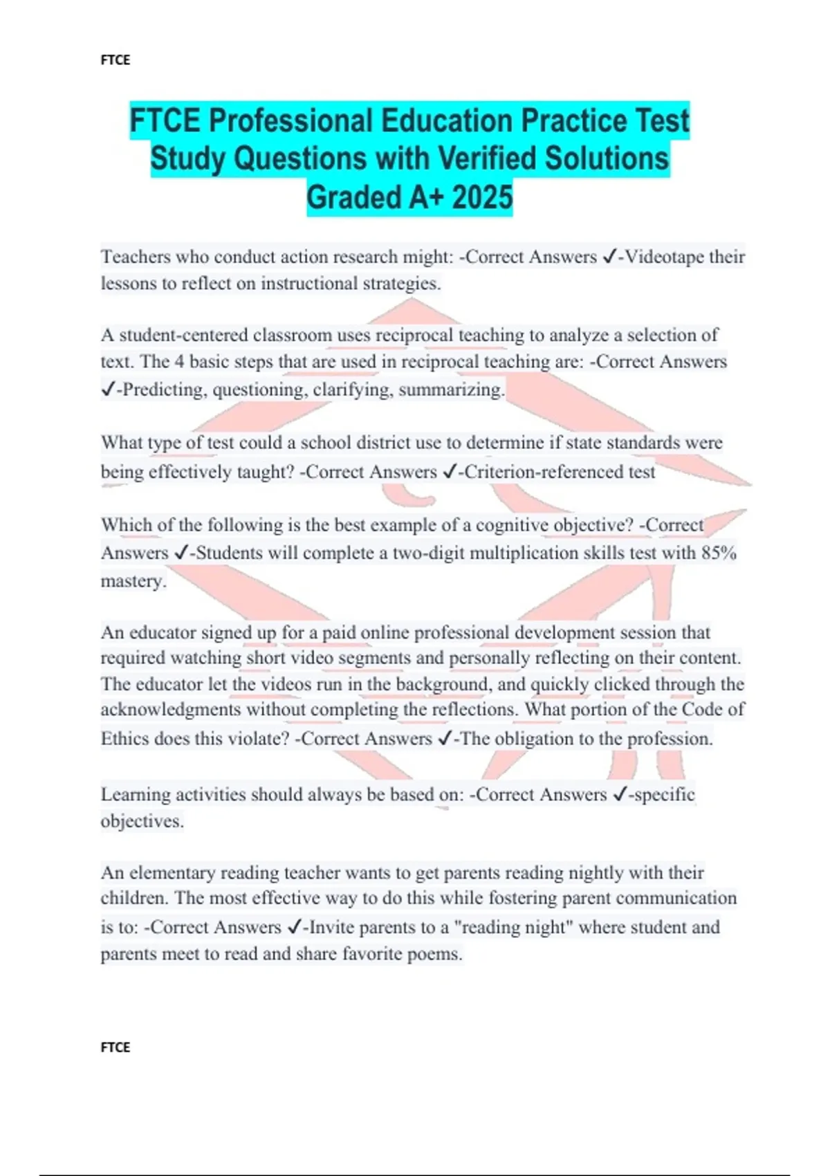 FTCE Professional Education Practice Test Study Questions with Verified Solutions Graded A+ 2025