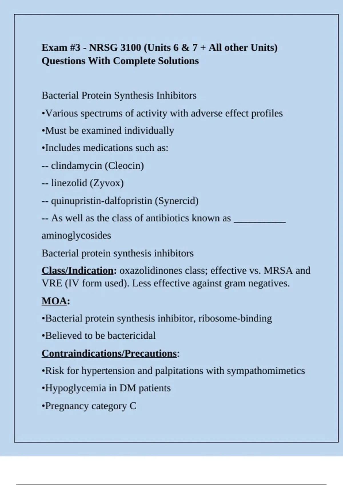 Class/Indication: oxazolidinones class; effective vs. MRSA and